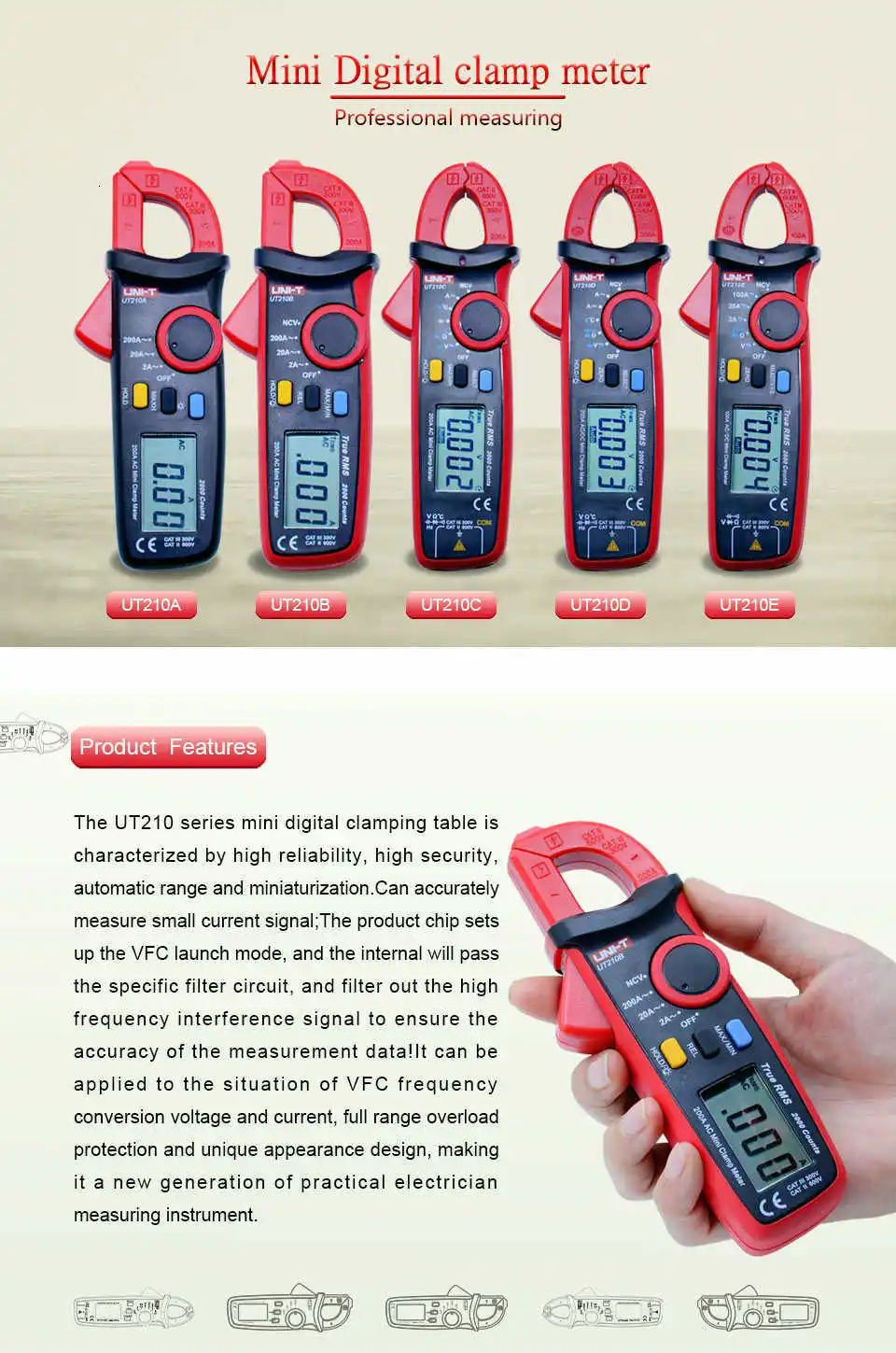 UT210D от UNI-T представляет собой мини 200A True RMS Автоматический диапазон цифровой клещи с 2000 счетом дисплея. Это портативное и многофункциональное устройство.