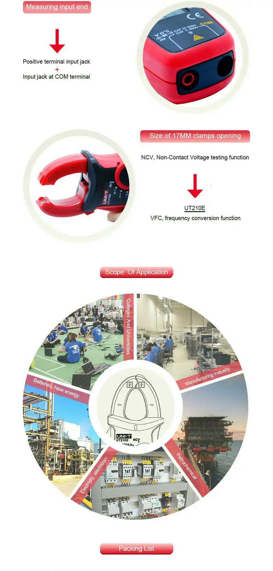 Упаковочный лист:1 * измеритель зажима1 * Тестовые провода (за исключением UT210A и UT210B)1 * сумка (кроме UT210A и UT210B)1 * цветная коробка1 * точечный контактный температурный зонд (за исключением UT210A и UT210B и UT210E)