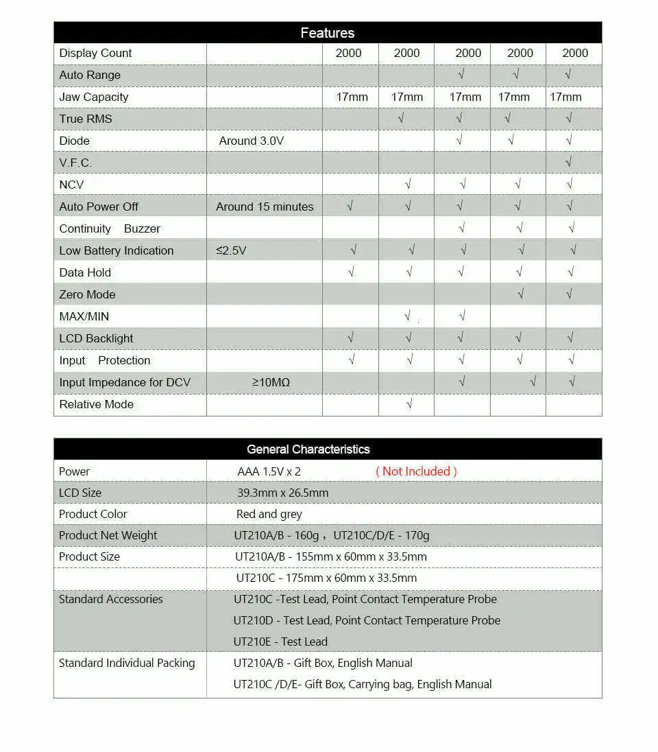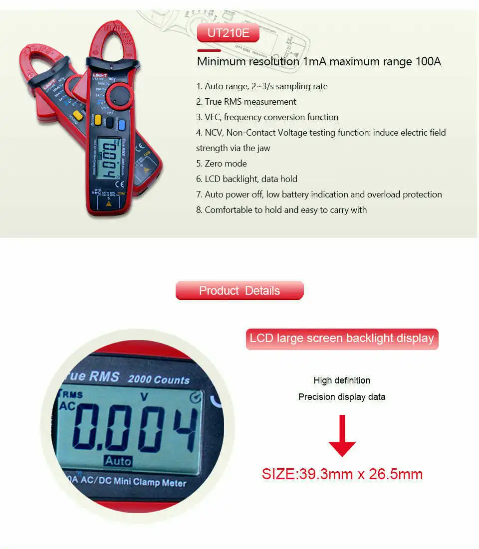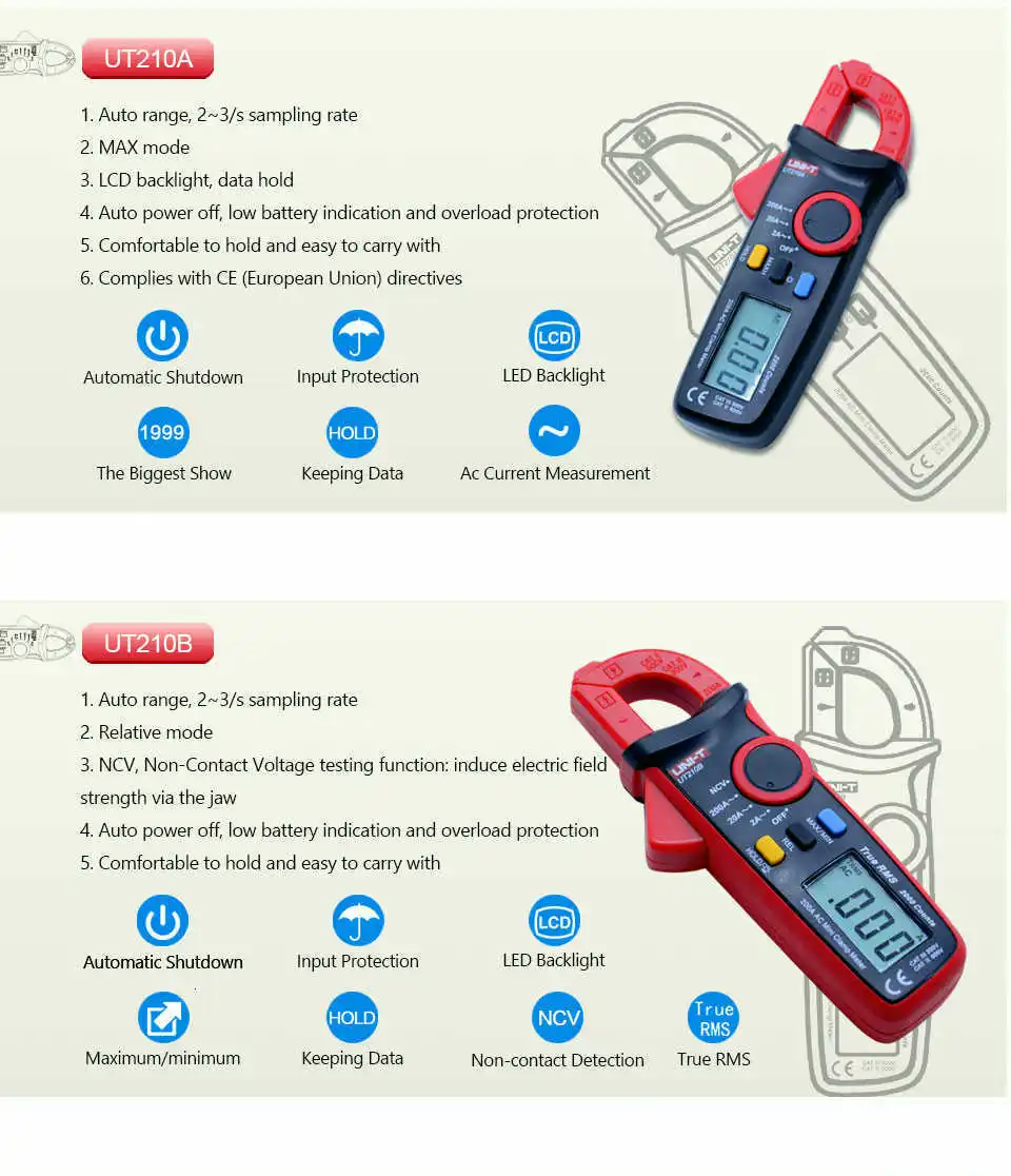 UT210D характеристики:Высокоточная Функция измерения частоты1. Автоматический диапазон, частота дискретизации 2-3/с2. Истинное измерение RMS3. ЖК-подсветка, хранение данных4.NCV, Бесконтактное тестирование напряжения Функция: вызвать электрическое поле силы через челюсть5. Автоматическое выключение, Низкая индикация батареи и защита от перегрузки6. Удобно держать и легко носить с собой7. Нулевой режимВнимание:1. UT210A и UT210B только может проверить ток переменного тока!2.UT210A и UT210B включены только руководство пользователя на английском языке, клещи и цветная коробка!