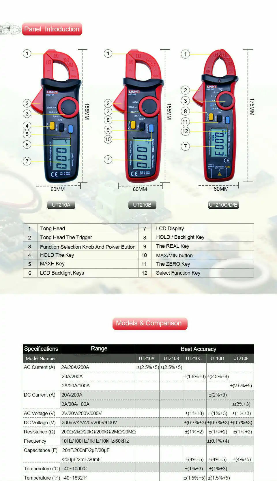 Основные характеристики:1. Автоматический диапазон, 2 ~ 3/с частота дискретизации2. Истинное измерение RMS (только UT210B/UT210C/UT210D/UT210E)3.VFC, функция преобразования частоты (только UT210E)4.NCV, Бесконтактное тестирование напряжения Функция: вызвать Электрическое Поле Прочность через челюсть (только UT210B/UT210C/UT210D/UT210E)5. Нулевой режим (только UT210D/UT210E)6. ЖК-подсветка, хранение данных7. Автоматическое выключение, Низкая индикация батареи и защита от перегрузки8. Удобно держать и легко носить с собой (Вес изделия: 160 г/170 г)9. Соответствует директивам CE (Европейский союз)