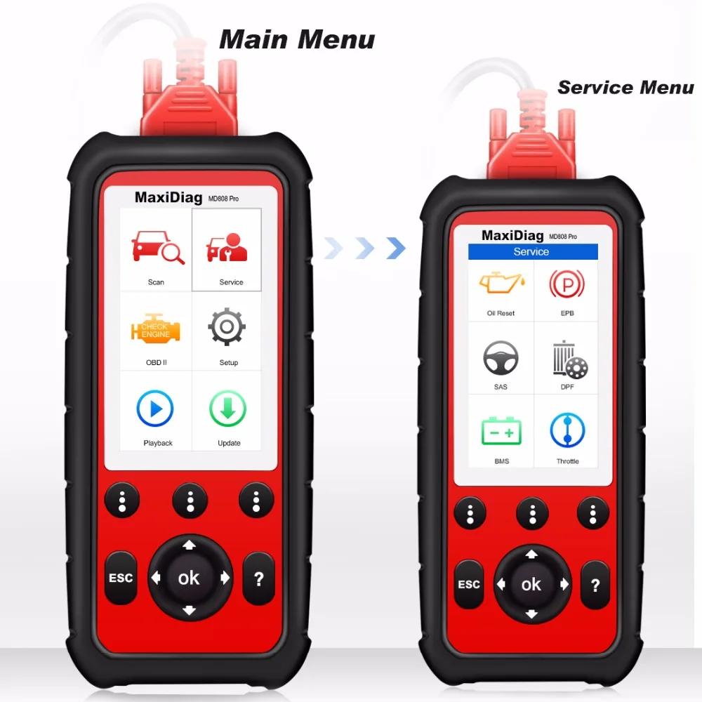 MaxiDiag MD808 ProСоздан, чтобы перевести ваш диагностический опыт на совершенно новый уровень. Загружен сбросом обслуживания масла, регистрация и сброс батареи, парковочная тормозная колодка повторно учатся после замены, датчик угла поворота рулевого управления и дизельные функции регенерации фильтра твердых частиц, MD808 Pro может получить доступ ко всем доступным модулям для лучших операций по диагностике. Со всем, что заключенная в 4-дюймовый ручной прибор, нет лучшего Многофункциональный сканирующее устройство на рынке.