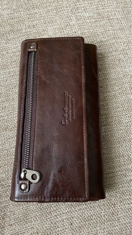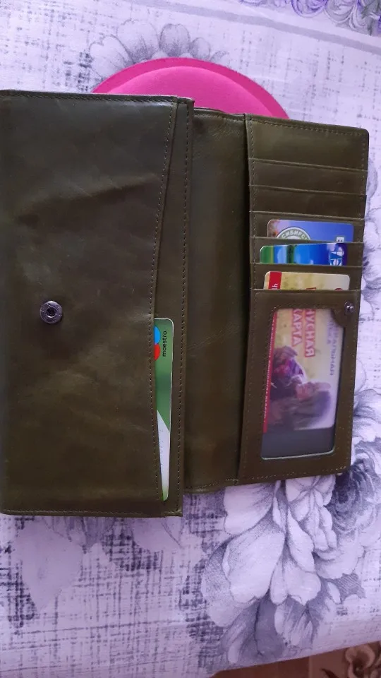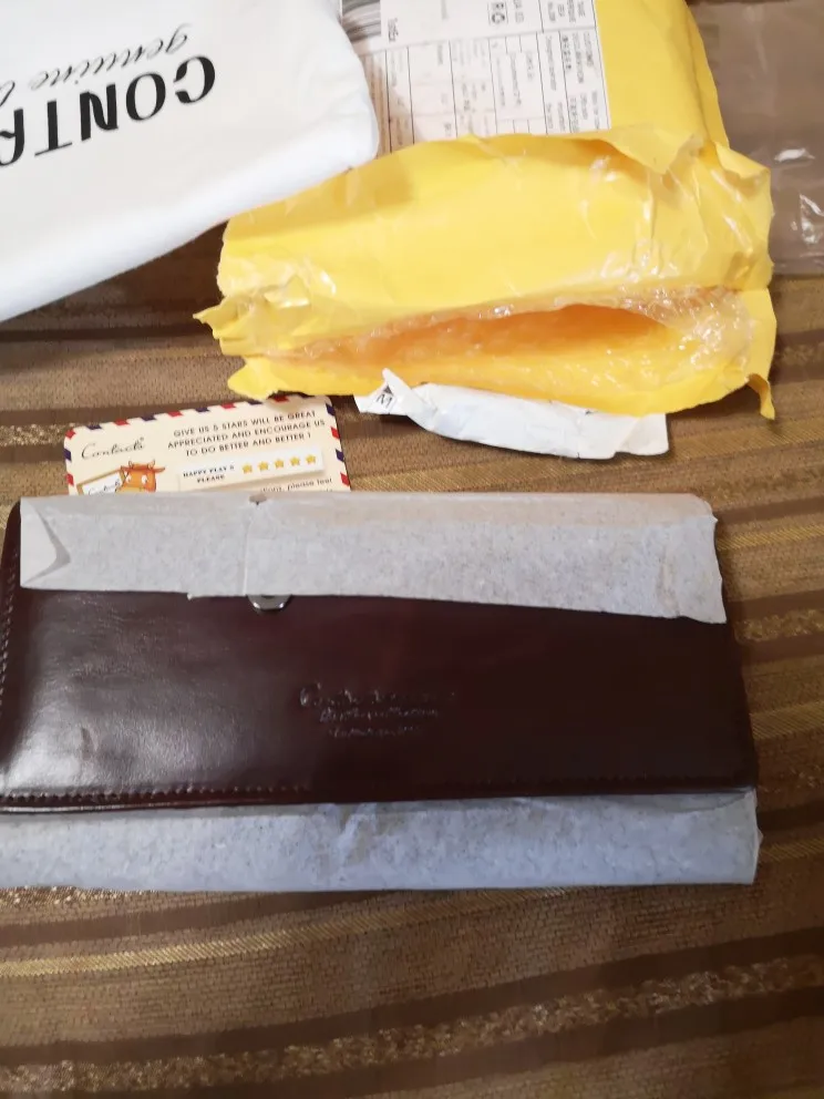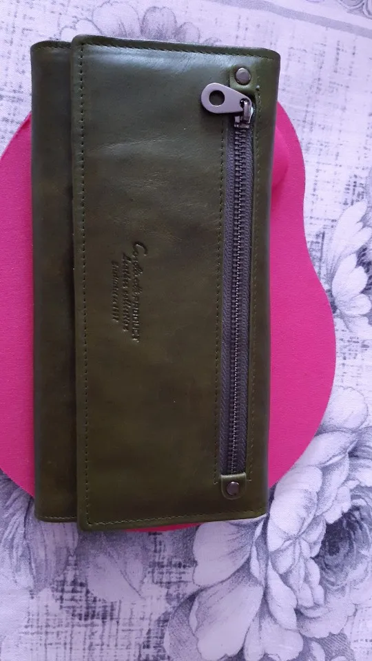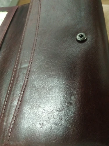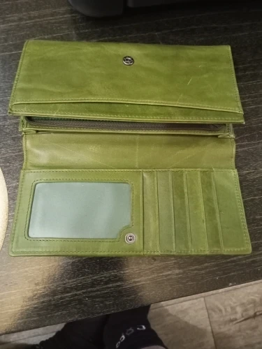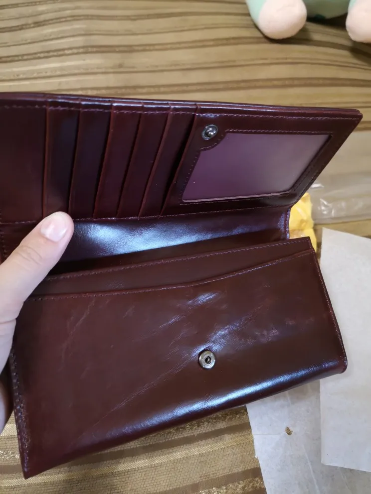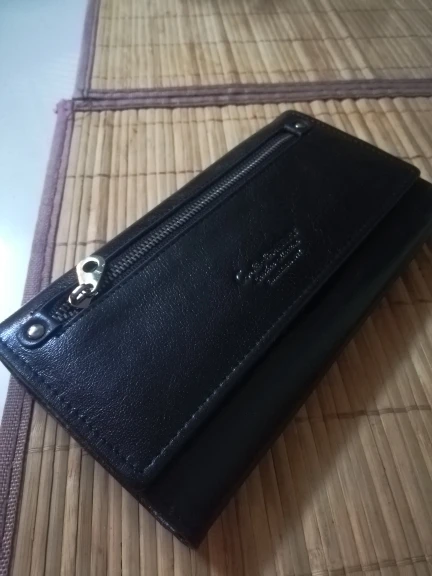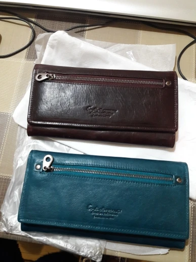 Кошелёк пришёл хорошо упакованным, качество просто отличное! Настоящая кожа, пахнет кожей, внутри вложен кусочек кожи для подтверждения. Цвет тёмный бордовый, смотрится достойно. Все строчки ровные, замки работают, нет никаких недочётов. Внутри вложена карточка с контактами продавца и рекомендациями по уходу за кожаным кошельком. Очень довольна. Спасибо продавцу