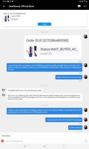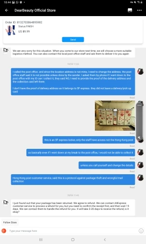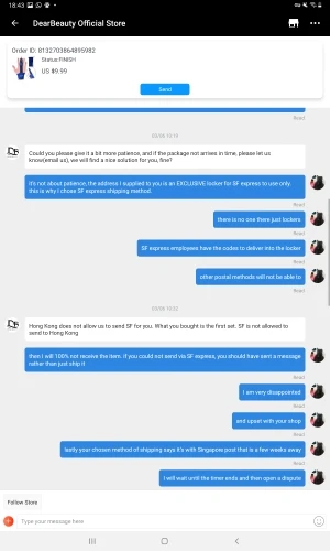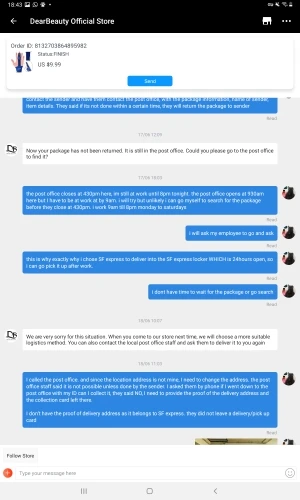 Во-первых, товар никогда не получен. Во-вторых, ужасно обслуживание клиентов. Они в Китае, и я в Гонконге. У них есть вариант доставки для SF express, который для меня 2 дня, очень быстрый. Я выбрал доставку SF express и дал им адрес, который был только квитанцией SF express, автоматический шкафчик обслуживания. Они решили отправить его через почту Сингапура и, конечно, SF express хранилище не может принять его, так как там нет ни одного, кроме шкафчиков. Я связался с магазином, и мне сказали, что посылка была возвращена в местное почтовое отделение, и мне нужно было получить ее самостоятельно, при обращении в местное почтовое отделение мне сказали, что я не смогу получить товар, Отправитель должен был подтвердить мой ID, так как это не адрес доставки. В итоге посылка была возвращена обратно в магазин. Я запросил возврат и мне сказали, что я должен принять посылку, как получил, прежде чем они вернут мне деньги. Наконец-то я открывал спор и заставил их вернуть мне деньги. Для меня страшный опыт ........