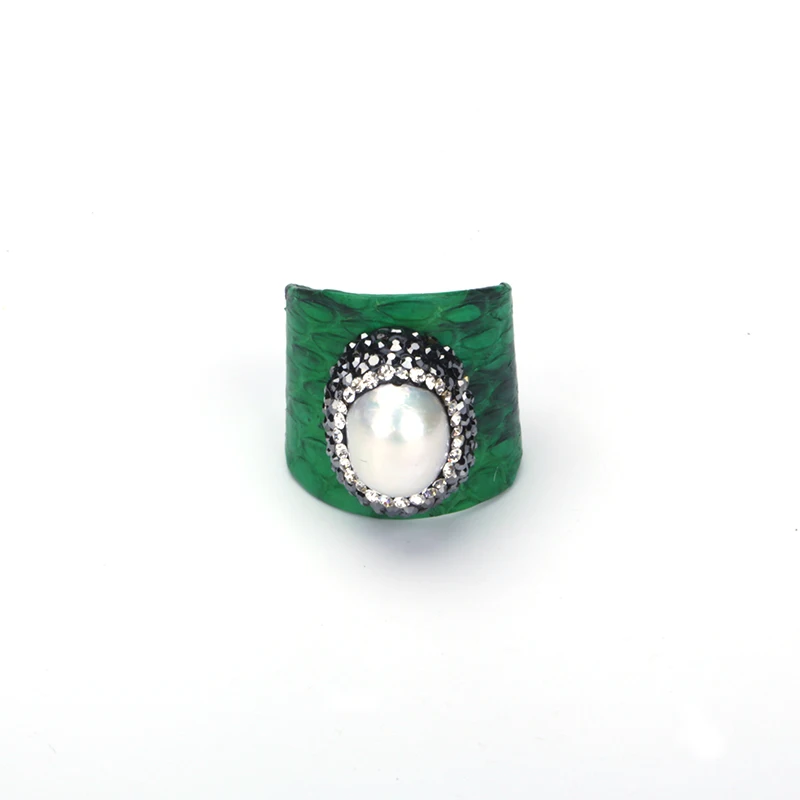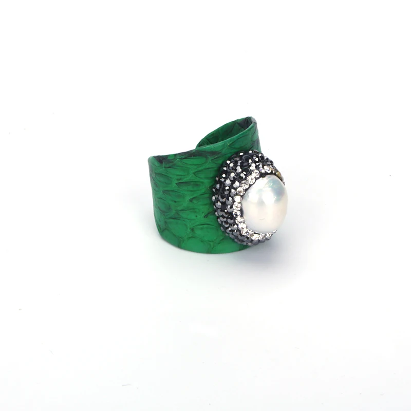 KEJIALAI Роскошные ювелирные изделия натуральный жемчуг бусина Стразы Шарм Зеленый цвет настоящая змеиная кожа регулируемое Открытое кольцо манжета для женщин