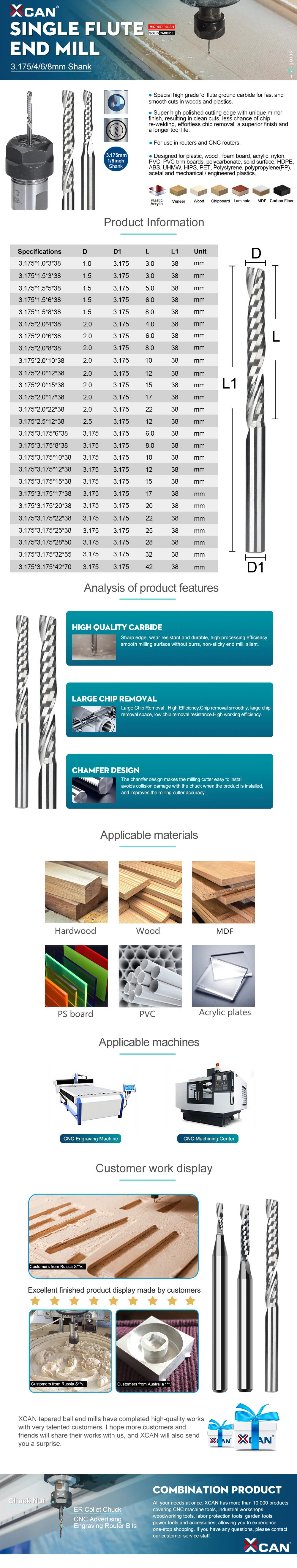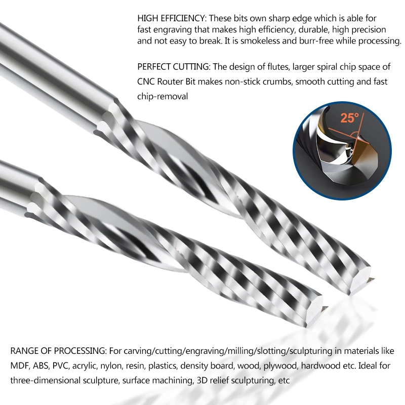 Фрезы Спиральные с одной канавкой, 3,175 мм, 15172022 мм, 10 шт.