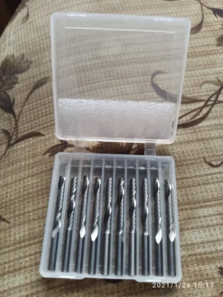 Это вобще не фрезы, тупые как валенок, на некоторых край подожденный, как будто б. у. Материал не режет а рвет. Заказал 3 пачки, все тупые. Хдф 3мм скорость 5 мм. сек. Ломаются. Буду возвращать. Незнаю кто пишет положительные отзывы, наверное боты