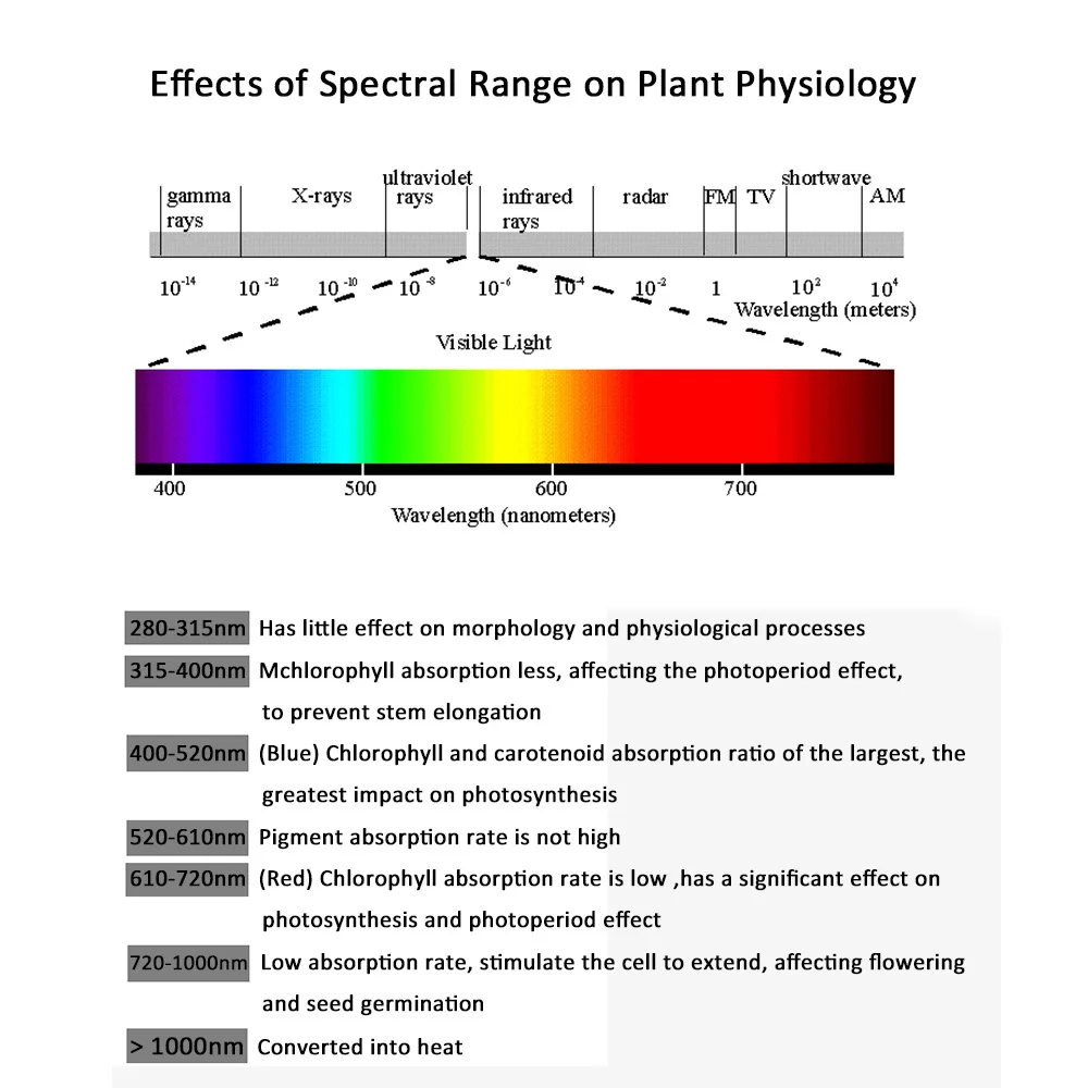 Фотосъемка поглощает свет с длиной волны в 380nm-760nm, среди которых 610-720 нм и 400-510 нм являются пиковой областью поглощения. 660nm deap read и 460nm синий свет сочетание дадут растению подходящий свет роста. Сочетание визуально выделит розовый свет. Для различных растений можно отрегулировать красный: синий уровень, чтобы получить наиболее подходящий свет для растений. Светло-красный: синий, рассчитанный на 3:1, 4:1, 5:1 хороши для ускорения роста листьев, для растений, таких как капуста, салат, шпинат и так далее. Светло-красный: Синий цвет 5:1, 6:1 хороши для растений, которые должны заполнять свет в течение всего периода роста, как лист суккулент. Светло-красный: синий рассчитан на 7:1, 8:1, 9:1 хороши для ускорения роста корня, для растений, таких как баклажаны, помидоры, Длинные бобы, цветной перец, огурец и так далее.