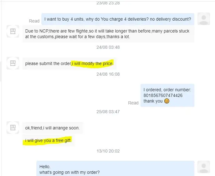 Так как я должен был оплатить доставку каждого листа, я заказываю ($14,86), я свяжусь с продавцом перед оплатой. Он пообещал мне снять цену после того, как я сделаю заказ (которого он не сделал), вместо этого он сказал, что отправит мне подарок. Подарок для младенцев на 0,2 доллара, если я покупаю водонепроницаемые листы, моему ребенку не менее 2 лет! На доставку в мою страну ушло более 2 месяцев (вещи, которые я заказал через 10 дней после этого заказа, прибыли в течение 1 дня (с той же стандартной доставкой). И когда он наконец пришел сюда, я должен был заплатить больше $10, чтобы получить его, так как продавец выбрал вариант «Быстрая доставка» в моей стране. В целом я заплатил $25 за $30 продукции. Лист, который он сам двигается и не держит мочу внутри (он высыхает со стороны), я просто брошу $55 в туалет. На фотографиях: оплата, обещания, «подарок», дополнительная (более) $10 доставка (35 NIS).