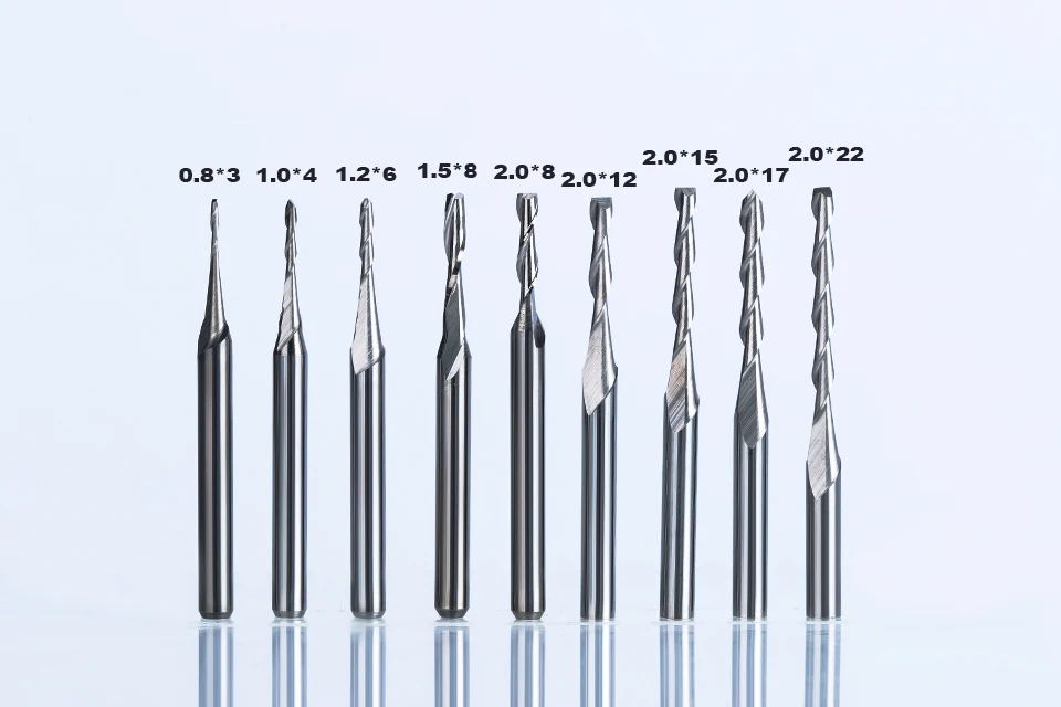 Диаметр хвостовика: 3,175 ммДиаметр режущей кромки: 0,8-3,175 ммОбщая длина: 38-65 мм