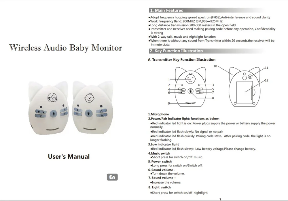 Упаковочный лист:1 x детский блок1 x родительский блок1 х адаптер переменного тока для детского блока1 х адаптер переменного тока для родительского блокаРуководство пользователя на английском языке (батарея в комплект не входит)-1 шт.Примечание:Пожалуйста, выньте аккумулятор или вилки питания, когда вы не используете его в течение длительного времени.Пожалуйста, не используйте внешнего источника питания в тех случаях, когда вы используете обычные батарейки типа АА, в чехол любой опасности.Перезаряжаемые батареи может быть только 1,2 V AA Ni-MH батарея, пожалуйста, не заряжать аккумулятор в чехол снижения времени работы от аккумулятора в тех случаях, когда вы не используете его в течение длительного времени.Пожалуйста, не работайте при высокой температуре и высоком магнитном поле