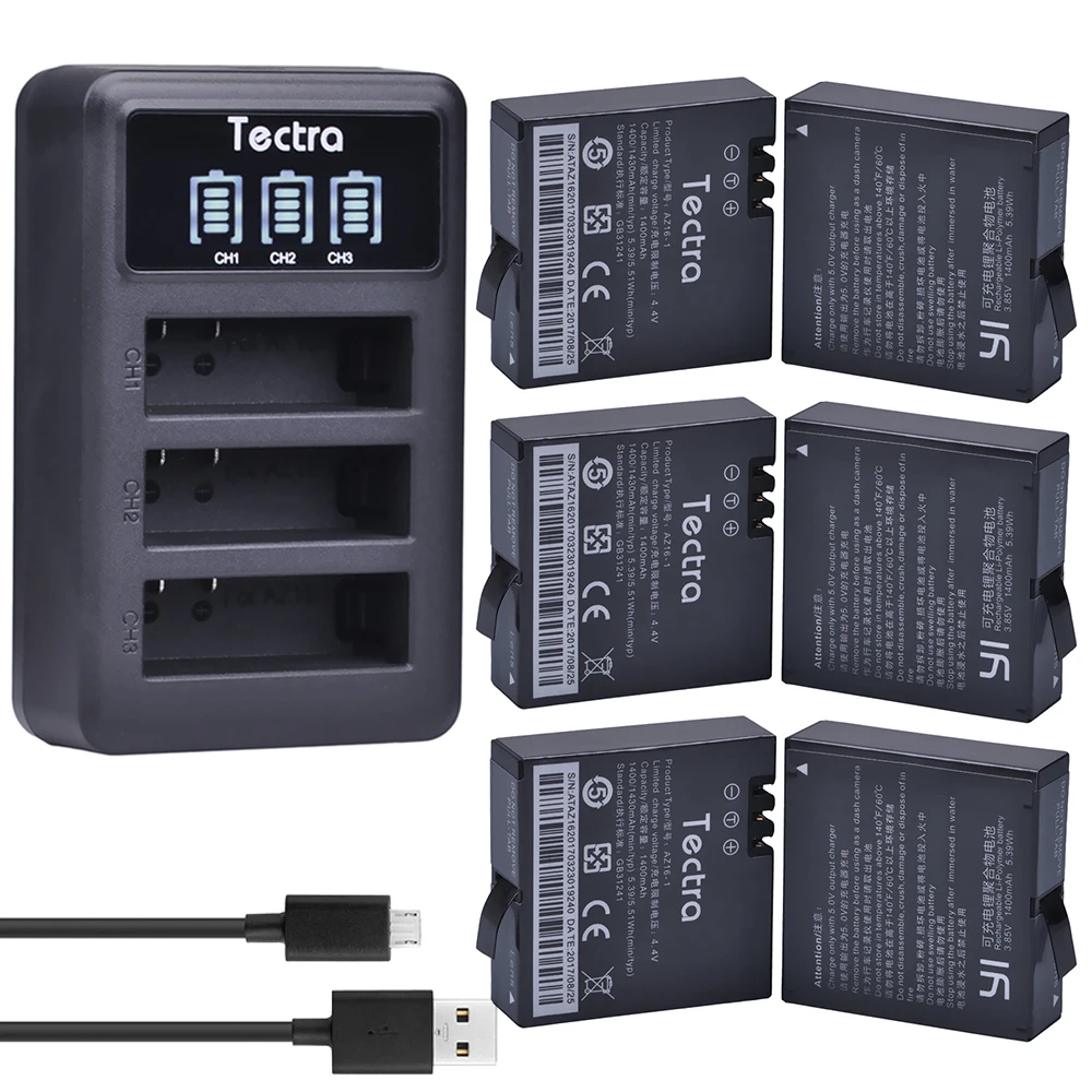 Tectra 6 шт. AZ16-1 1400mAh перезаряжаемые для спортивной экшн-камеры xiaomi yi батарея + usb-портами и светодиодным индикатором 3 Разъем для зарядного устройства