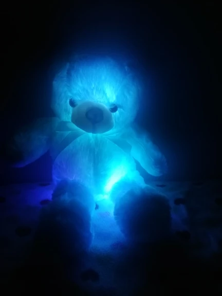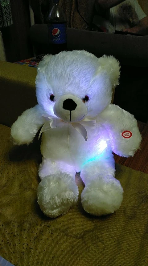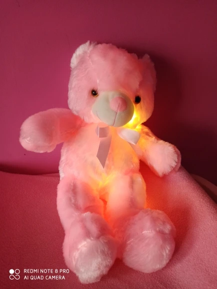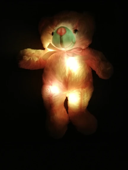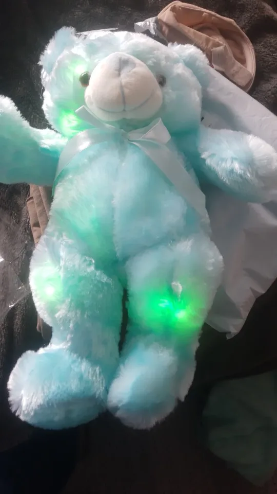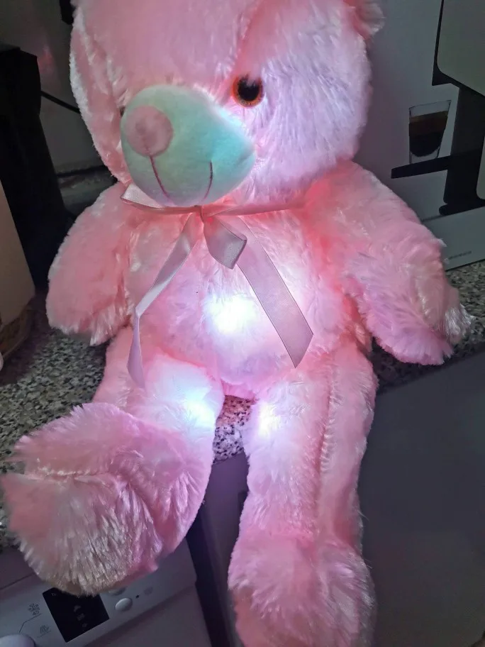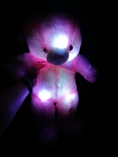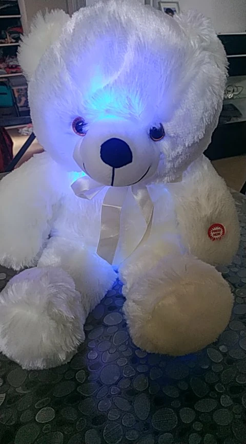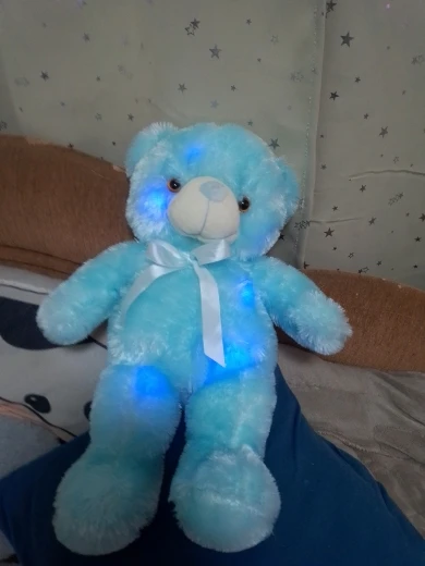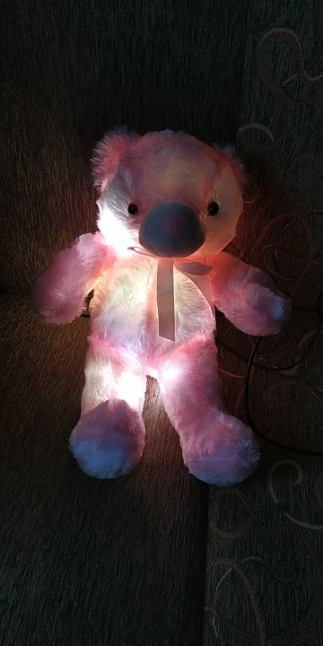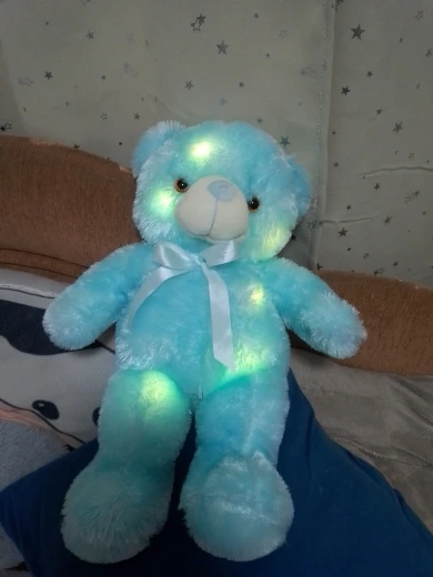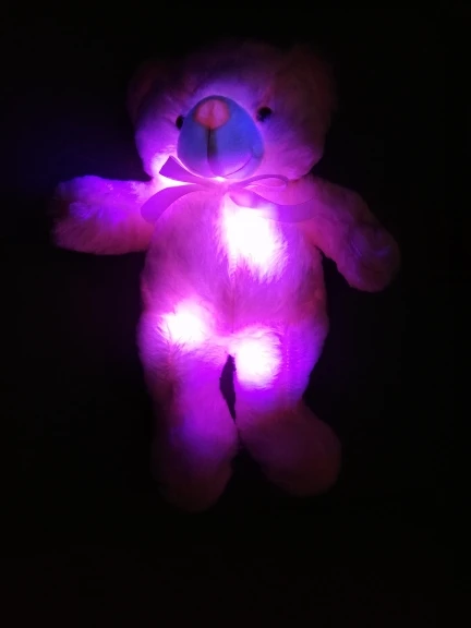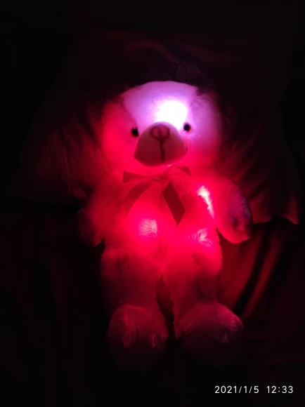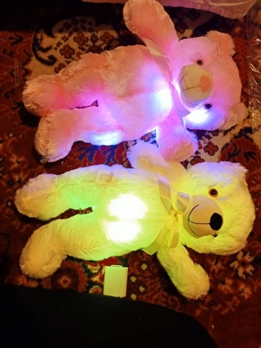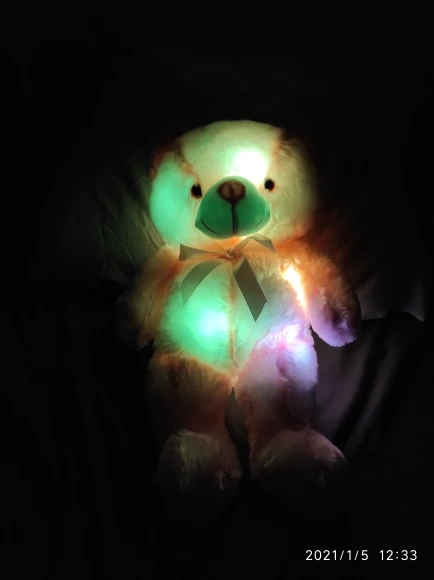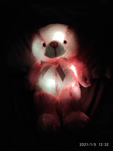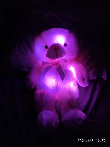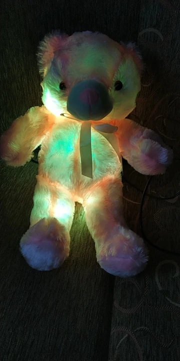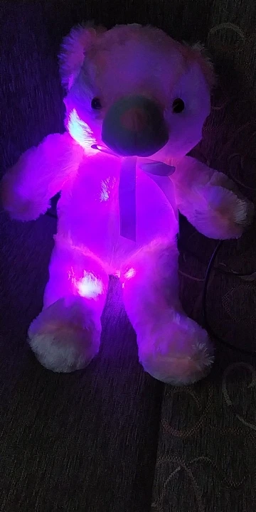 Мишка пришёл быстро, отслеживался, мягкий и пушистый, горит разными цветами, очень понравился!!! Продавцу спасибо за быструю отправку и доставку!!!