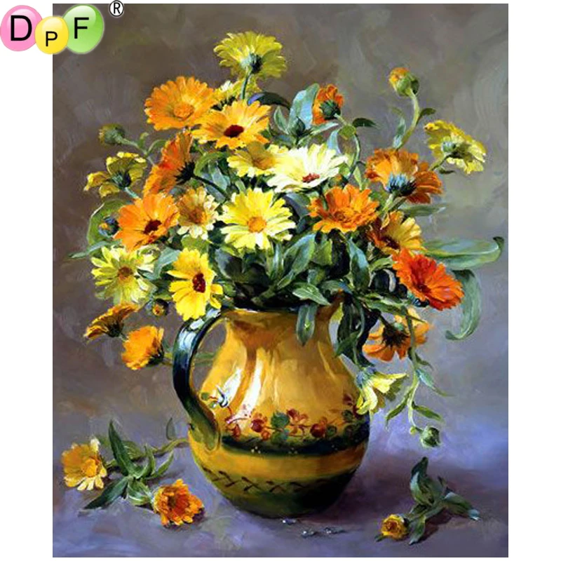 DPF DIY Бриллиантовая Вышивка Желтая цветы стеклянная ваза 5D карти...