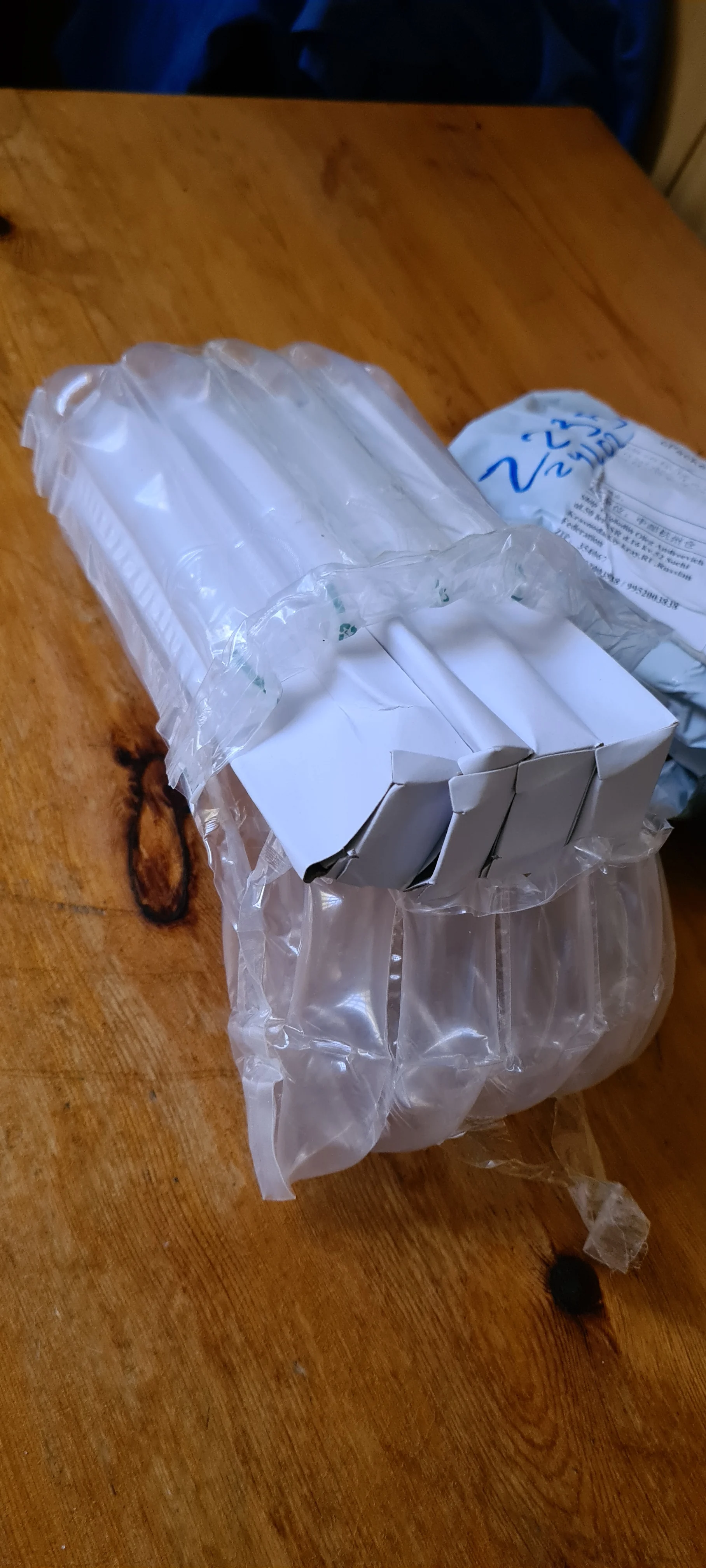 Упаковка выглядела очень стройной-недостаточной. Все коробки внутри пластиковой сумки были разрезаны-см. Фотографии. К сожалению, лампы внутри были нетронутыми.