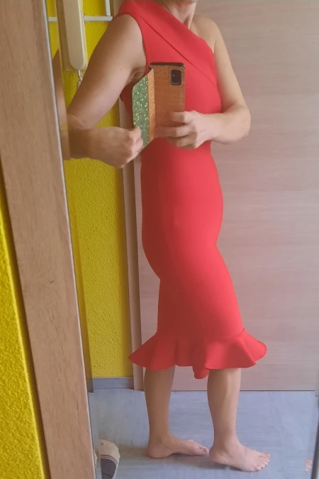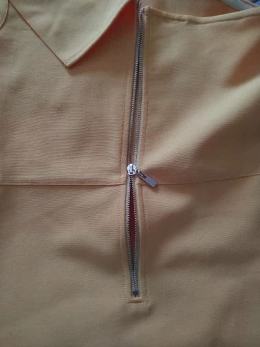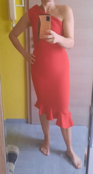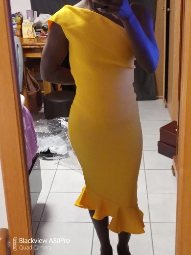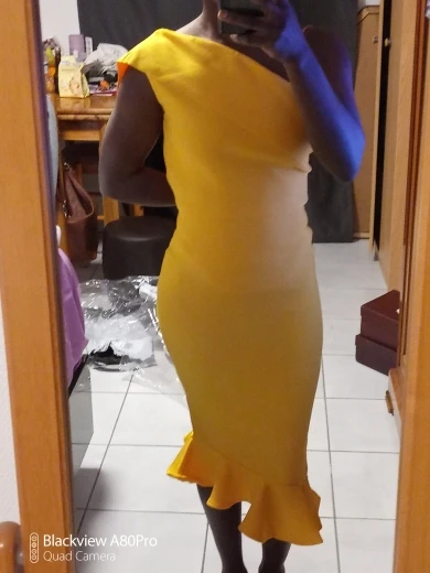Хорошая плотная ткань, растягивающаяся и эластичная. Быстрая доставка, размер правильный. Размер L для людей с более широкими бедрами! Застежка-молния была не скользит вверх (трудно закрыть), но для остального красивое и хорошее платье.