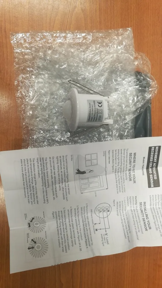Датчик движения пришел быстро. Датчик отправили без коробки-упаковки, просто завернули в пупырчатую пленку. Чувствительность датчика 2 метра. Может другую модель положили (A,B). Искал специально модель YCA1070C - брал у другого продавца с чувствительностью 6 метров, все работало реально без проблем.