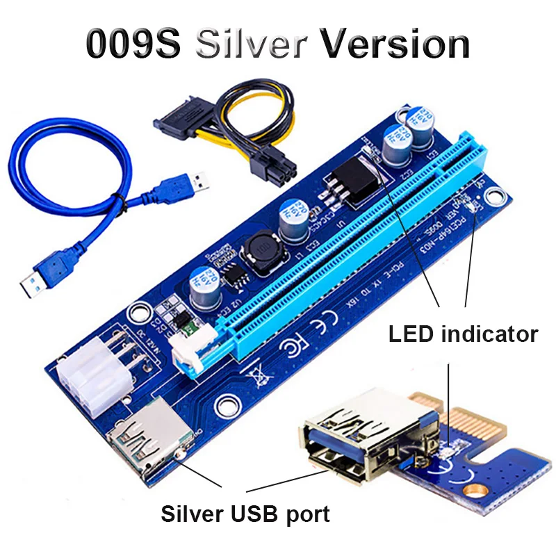 009S PCIE RISER 6PIN 16X для майнинга BTC с 2 светодиодами, экспресс-карта Sata, кабель питания и 60 см, Золотой USB 3,0, качественный кабель