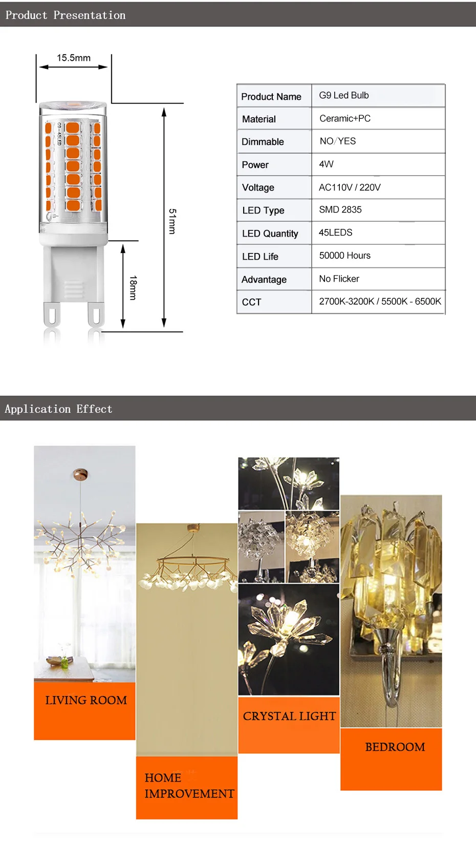 Приглушаемая светодиодный ная лампочка G9 без мерцания, 110В, 220 В переменного тока, 45 светодиодов S, 2835SMD, 3 Вт, LED лампа с керамическим держателем, освещение для люстры
