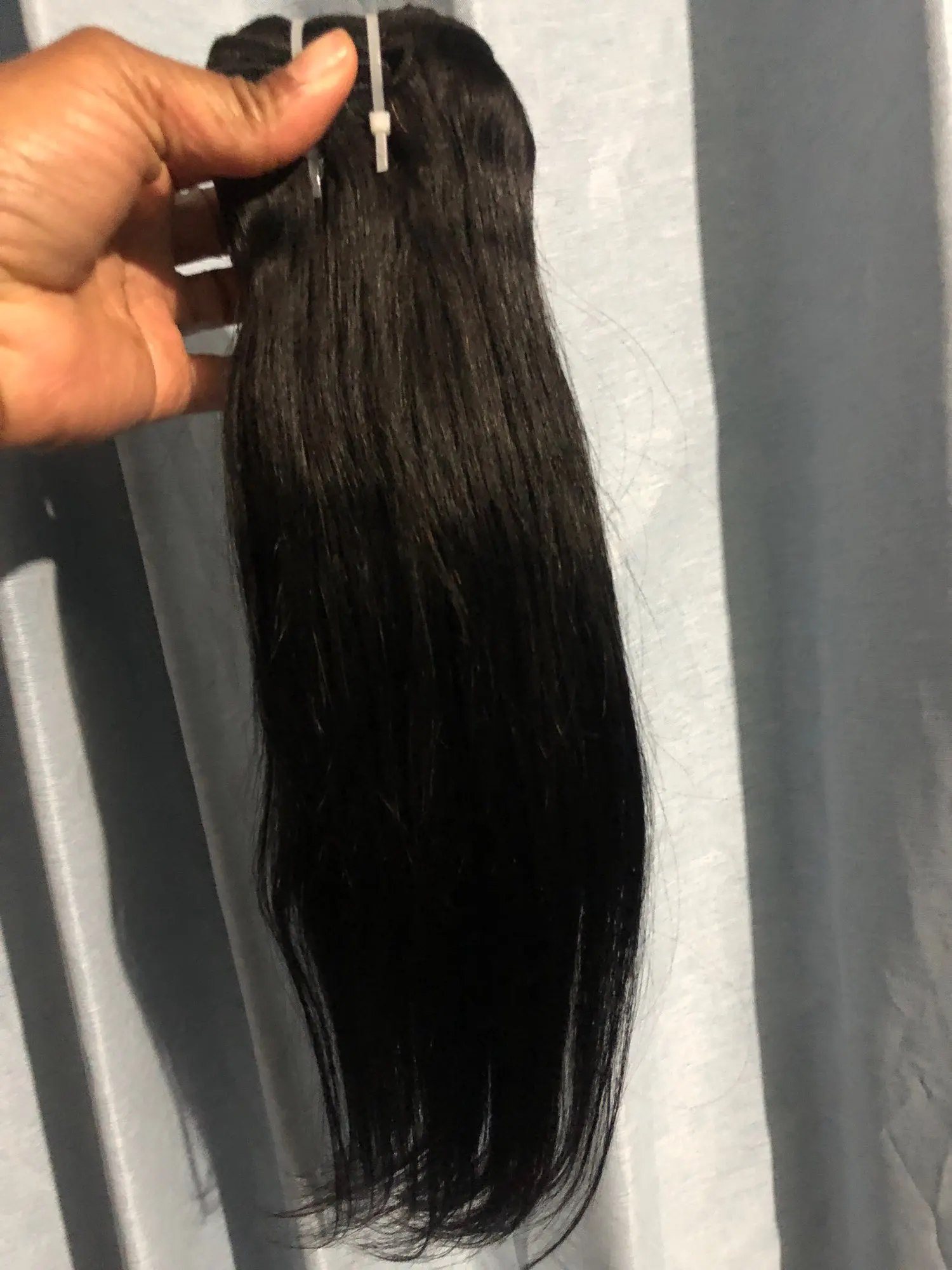 Длина волос от 6 "до 38", натуральный черный цвет, каждый пучок около 100 г. Меньше 18 дюймов, нужны 3 пряди, если длиннее, 4 или 5 пряди.