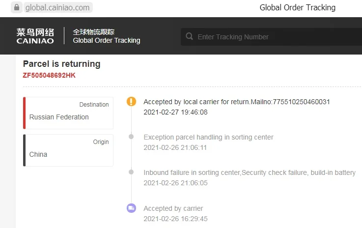 Страна: RU Доставка: Cainiao Super Economy 05.02.2021