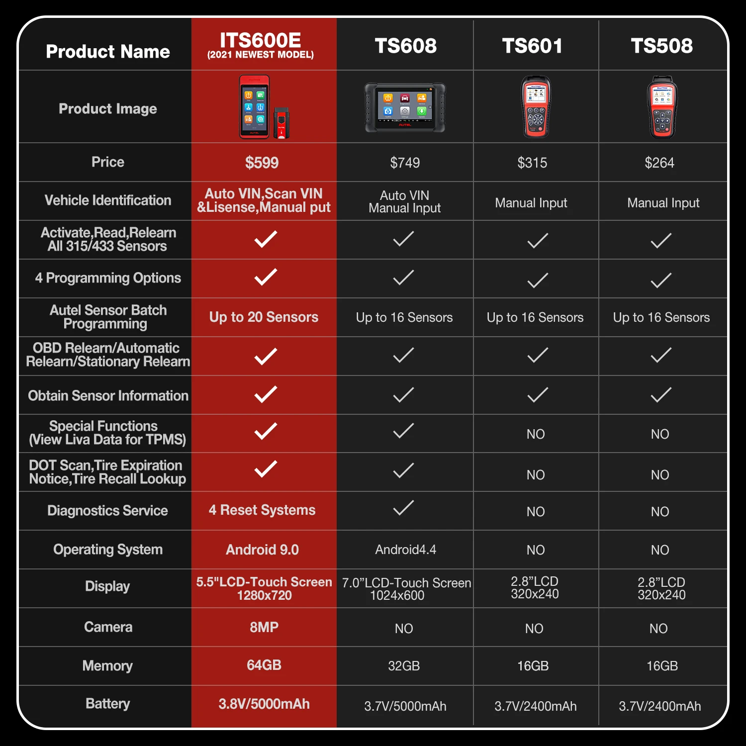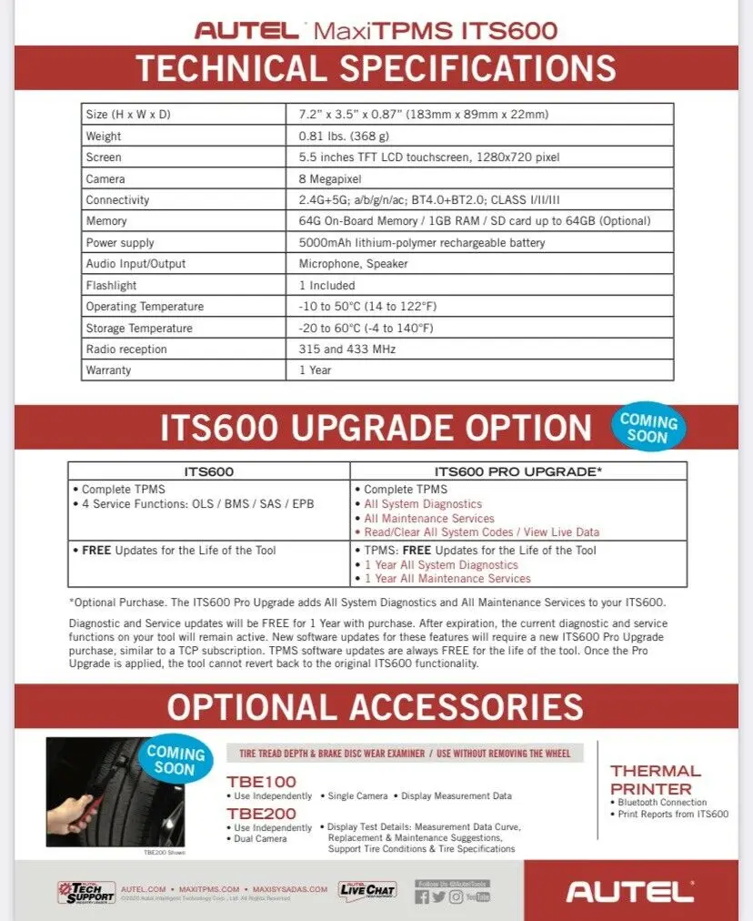 MaxiTPMS ITS600-это беспроводной планшет на базе Android с сенсорным экраном, который предлагает полные диагностические и Сервисные функции TPMS. Планшет с 5,5 дюйма с цветным дисплеем и Bluetooth интерфейс связи (VCI). Совместимость с американскими, азиатскими и европейскими TPMS-оборудованными транспортными средствами, ITS600 имеет улучшенный экран состояния TPMS, VINscan для быстрой идентификации транспортного средства, четыре варианта программирования mx-датчика, функция OBDII relearn и инструкции на экране для всех транспортных средств. ITS600 может активировать, читать и переосваивать все известные датчики, выполнять диагностику системы TPMS и четыре общих обслуживания. Кроме того, он обеспечивает сканирование номера точки, уведомление об истечении срока службы шин и доступ для поиска напоминания. ITS600 совместим с TBE200/TBE100 шин протектора и тормозного диска износа инструмента анализа, продается отдельно. Предоставляя обширную серию функций и функций, связанных с шинами, ITS600-ваш идеальный выбор для завершения TPMS и работы по охране здоровья шин.