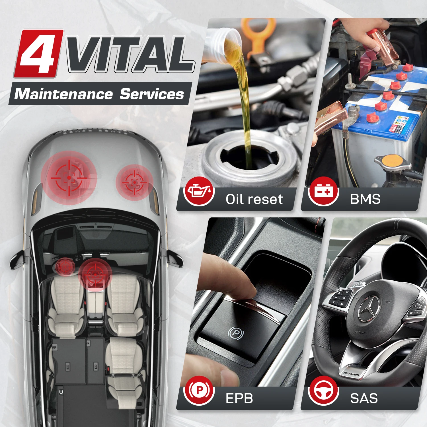 • Масляный светильник сброс• Электронное обслуживание тормозов• Регистрация батареи• Сброс угла поворота руля• Обновления функций обслуживания бесплатны в течение всего срока службы инструмента• Все системы диагностики и обслуживания программного обеспечения доступны с Pro Upgrade покупка