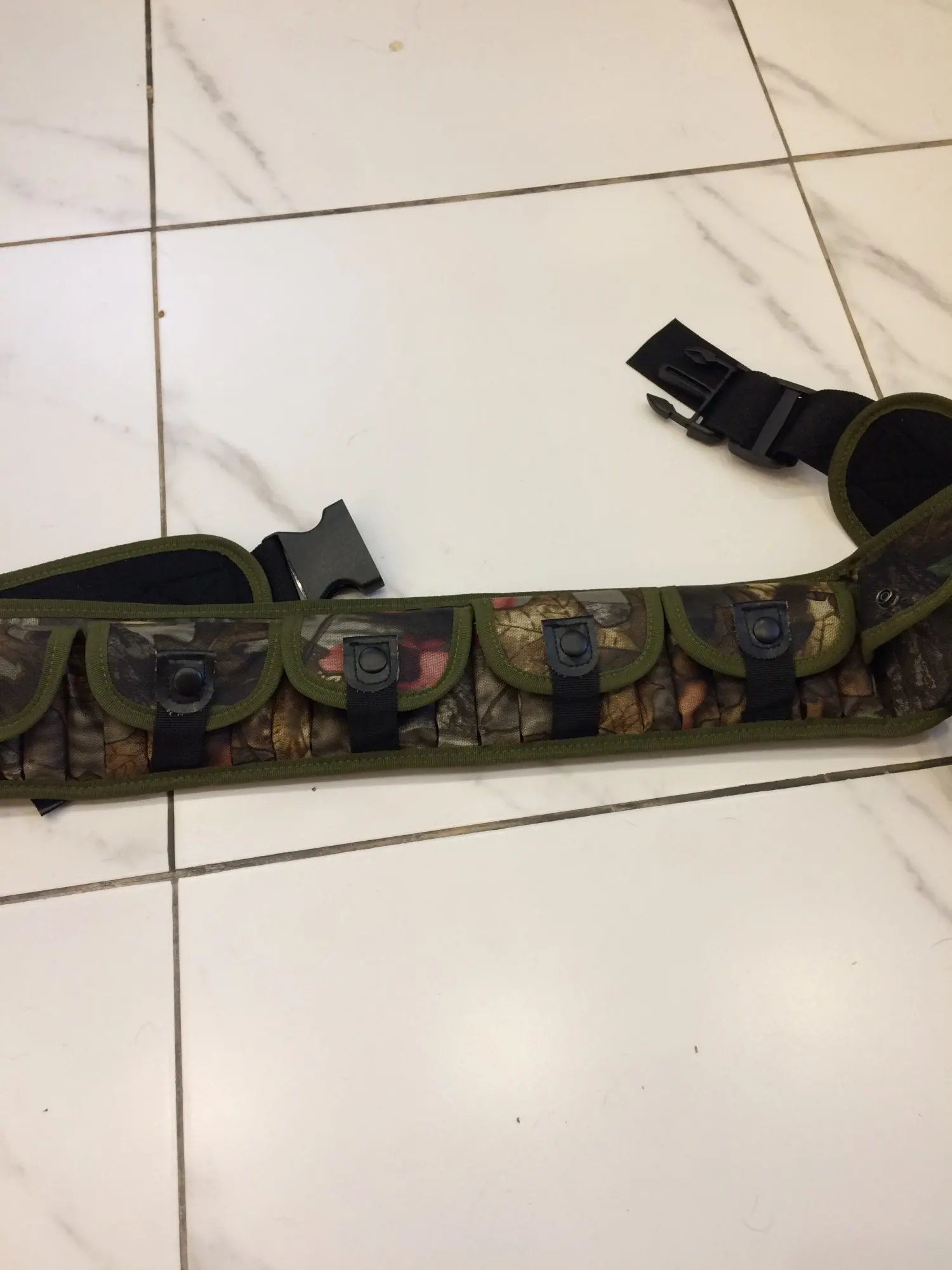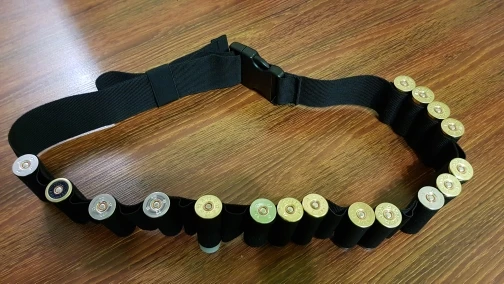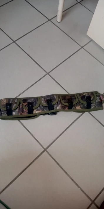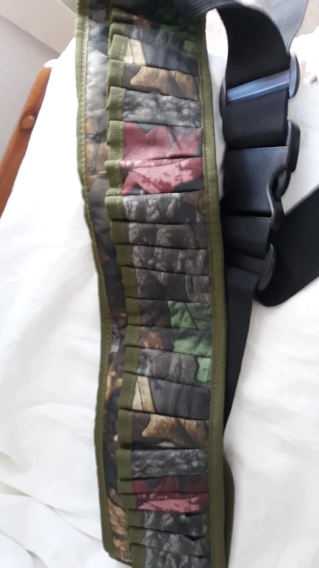 Патронташ на 25 патронов с двумя на мой взгляд бесполезными кормашками по бокам. Карманы закрываются на кнопке, патроны сидят не плотно если забудешь закрыть то при наклонах или беге по выпадают. В целом можно пользоваться.