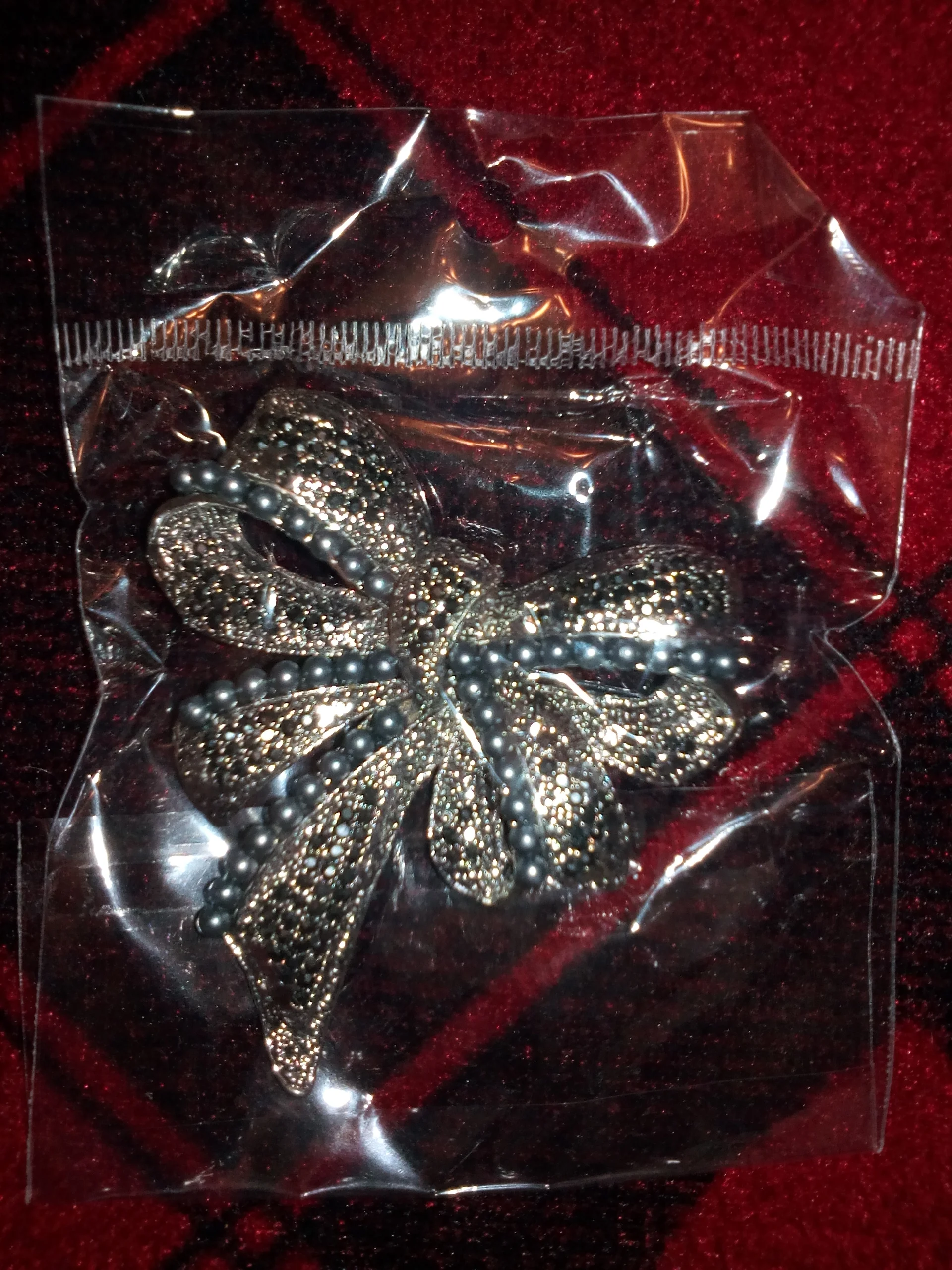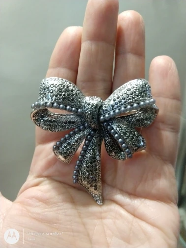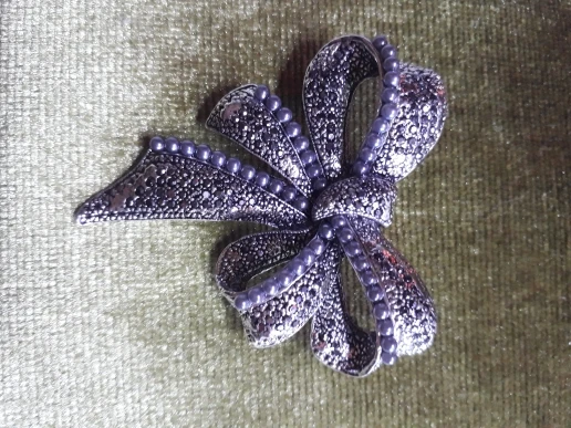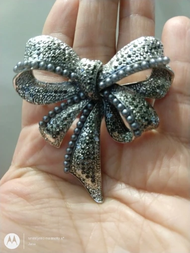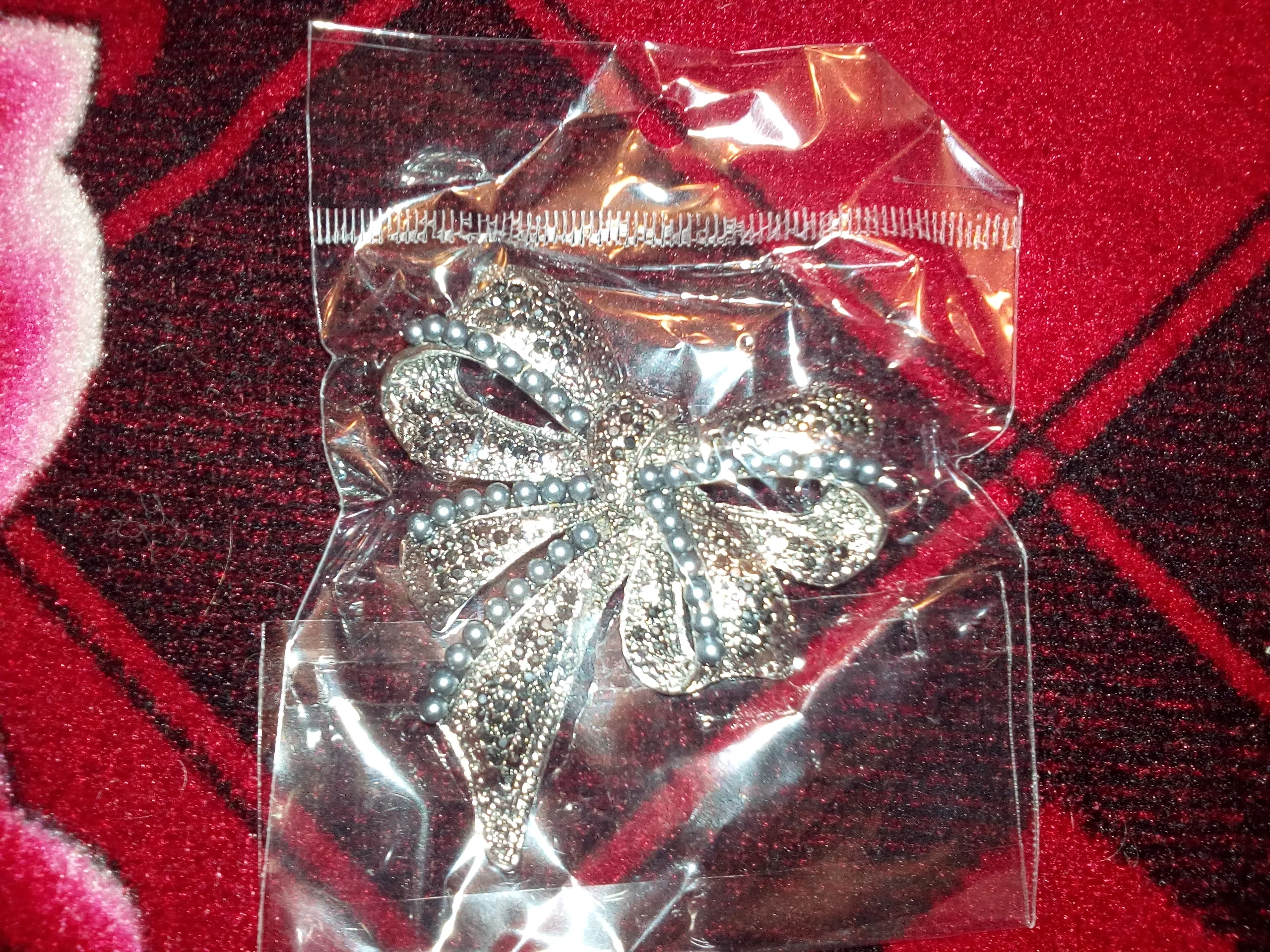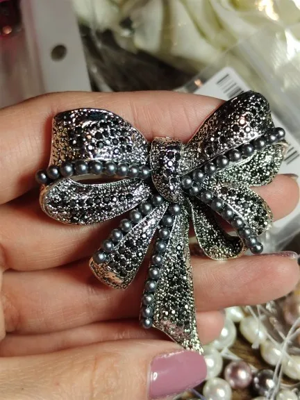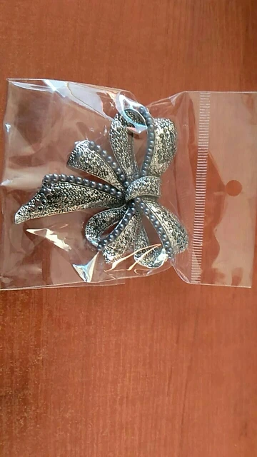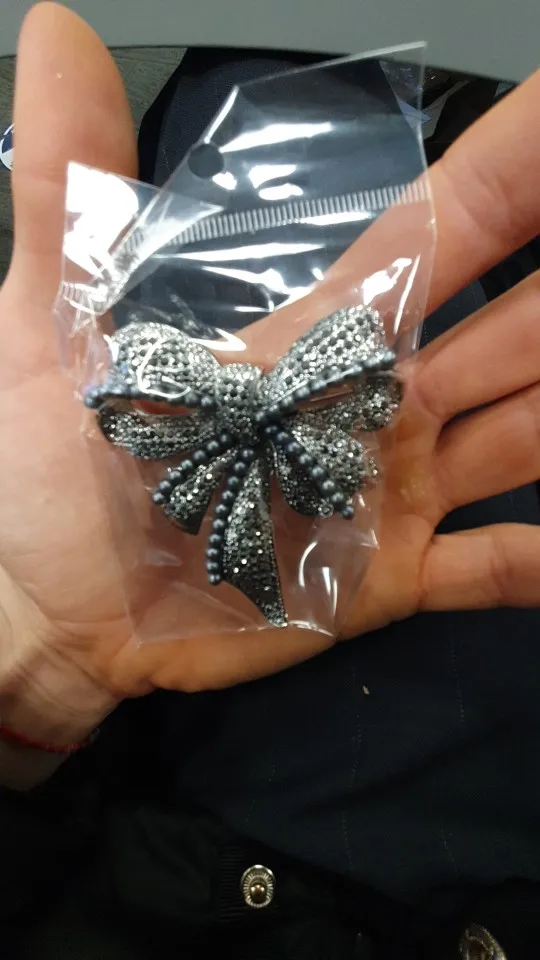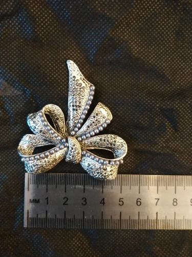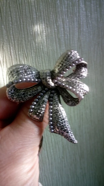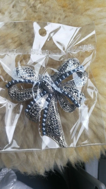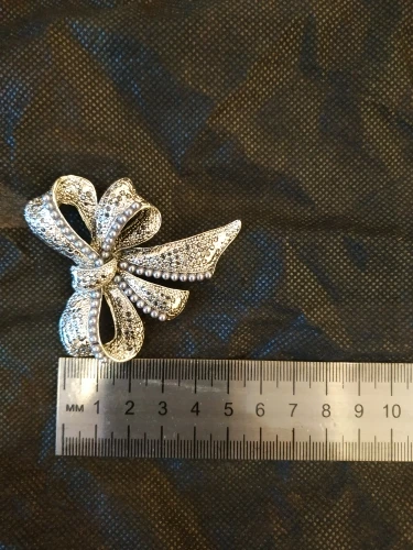 Очень красивый бантик на пиджак. Правда, мне кажется, что шарики (жемчужинки?) на рекламном фото покрупнее...потому что количество этих шариков на присланной мне броши в ряду БОЛЬШЕ, чем на фото. Значит, шарики помельче. И на жемчужинки не похожи. Как от шарикоподшипника. И вид у броши уже не совсем тот, что на рекламе. Жалко.