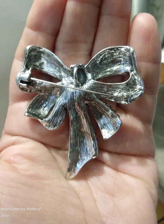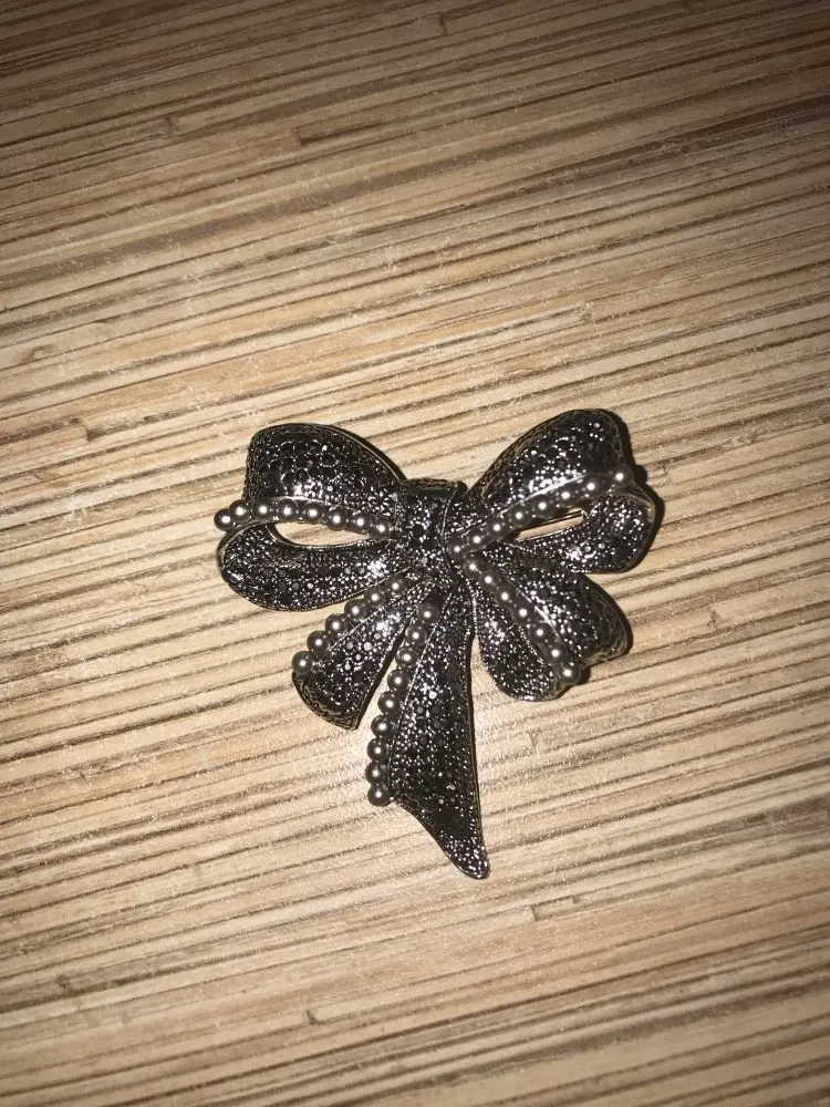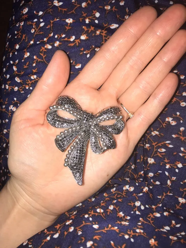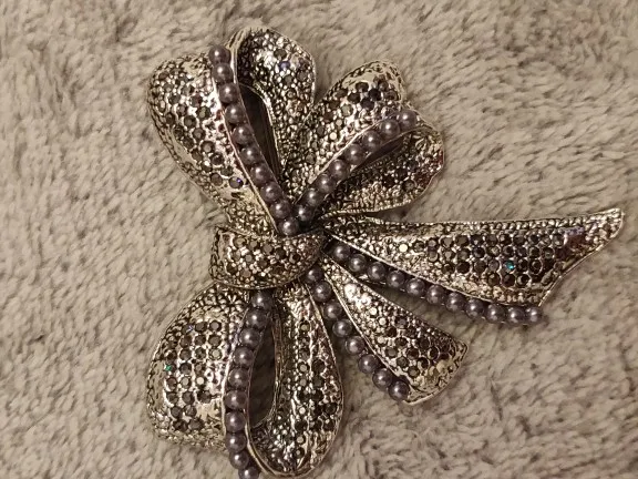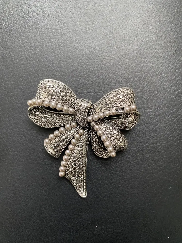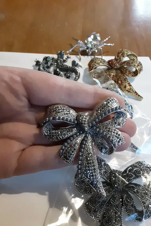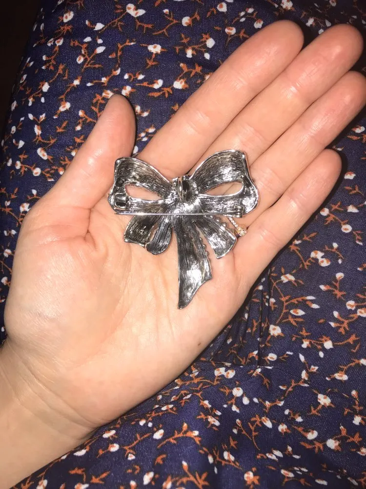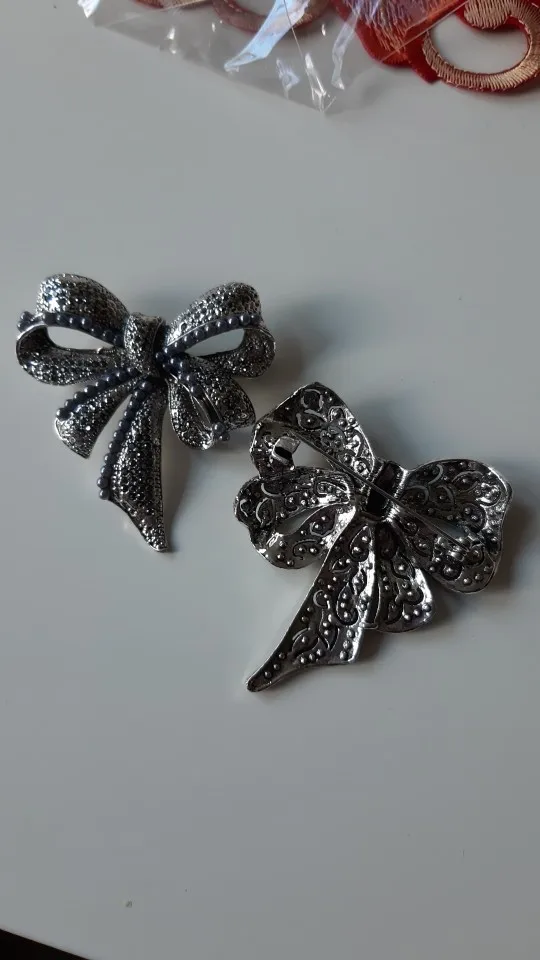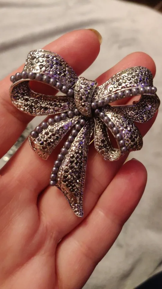 Очень красивый бантик на пиджак. Правда, мне кажется, что шарики (жемчужинки?) на рекламном фото покрупнее...потому что количество этих шариков на присланной мне броши в ряду БОЛЬШЕ, чем на фото. Значит, шарики помельче. И на жемчужинки не похожи. Как от шарикоподшипника. И вид у броши уже не совсем тот, что на рекламе. Жалко.