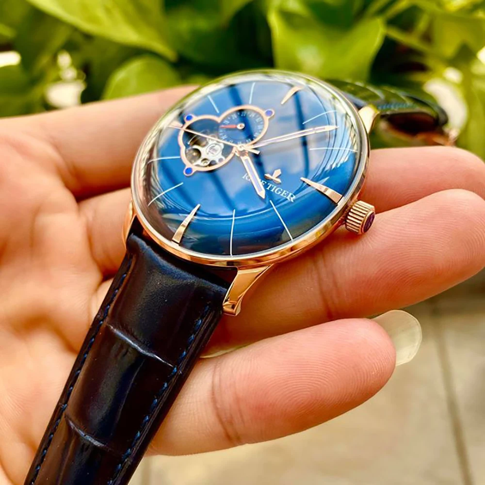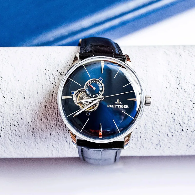 Новые дизайнерские синие часы Reef TigerRT, часы цвета розового золота с выпуклыми стеклами, автоматические часы для мужчин RGA8239