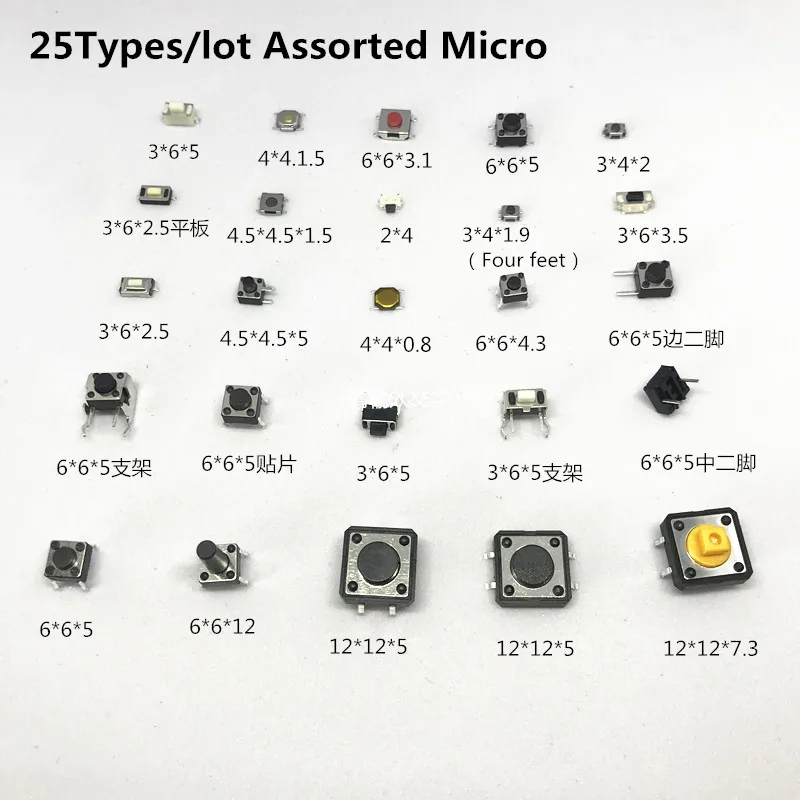 Микрокнопочный переключатель, 25 типовпартия, SMD DIP 2*4 3*6 4*4 6*6