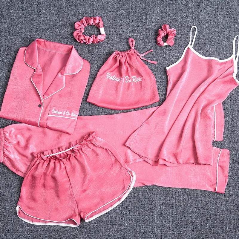Красивая одежда с длинными рукавами, 7 шт. (пальто + майка + длинные штаны + короткие штаны и 2 веревки для волос + сумка), шелковые женские пижамные комплекты с пижамными брюками