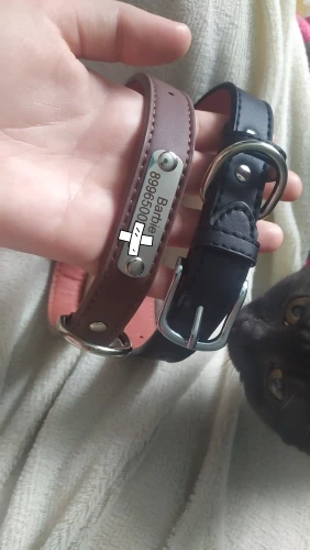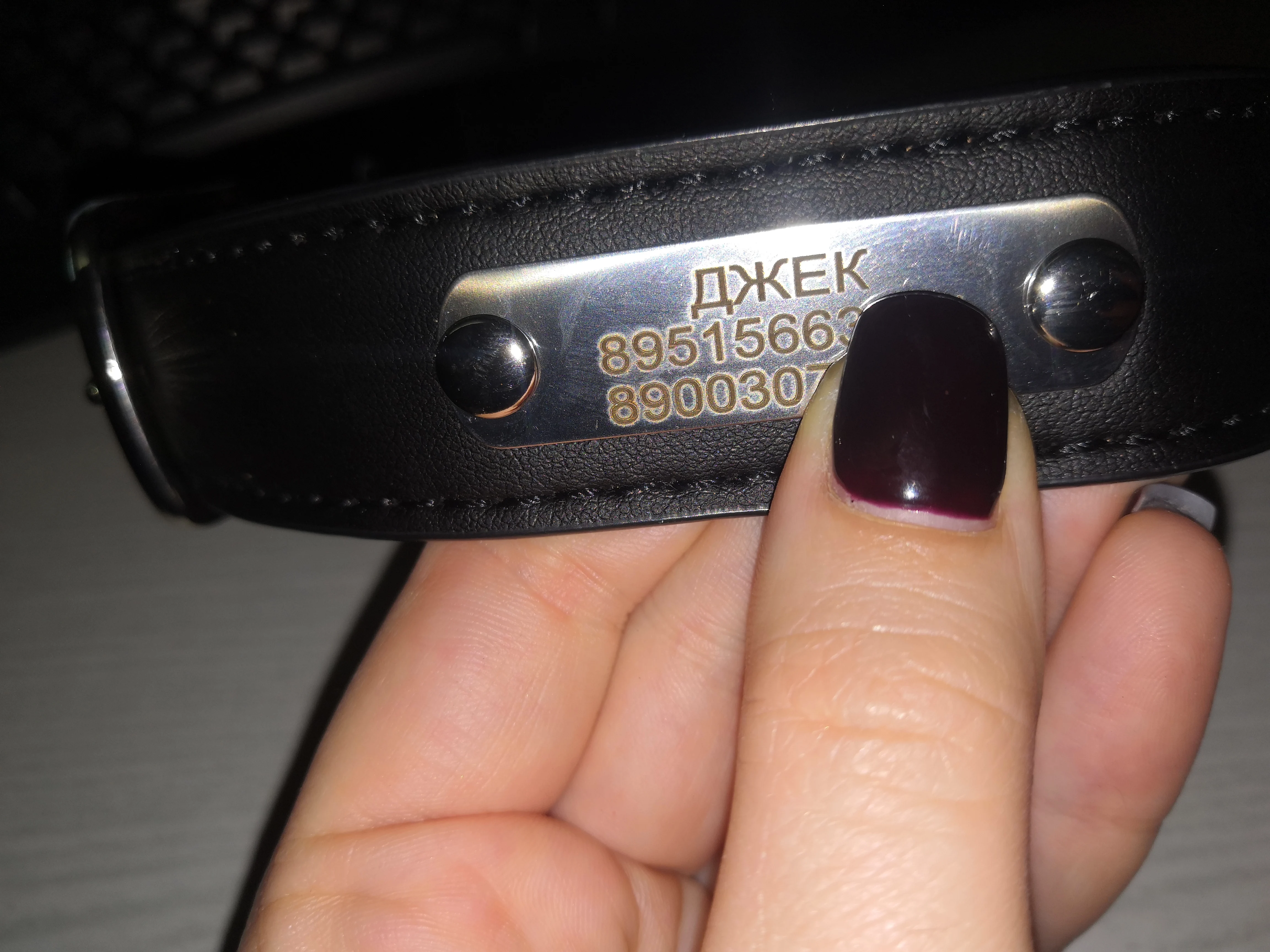 Надпись хорошо и четко выгравирована.Ошейник по верху из искусственной кожи.Сделан хорошо.