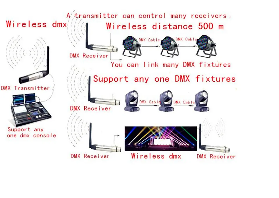 Беспроводной приемник/передатчик DMX512 передает стандартные данные протокола DMX512 (генерируемые консолью) беспроводным способом.