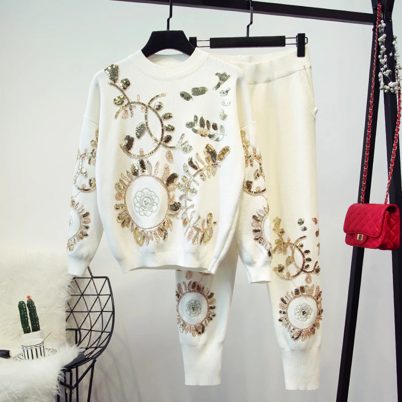 Высококачественный зимний женский трикотажный комплект 2020 года с блестками и вышивкой, вязаный комплект из двух предметов с длинным рукавом