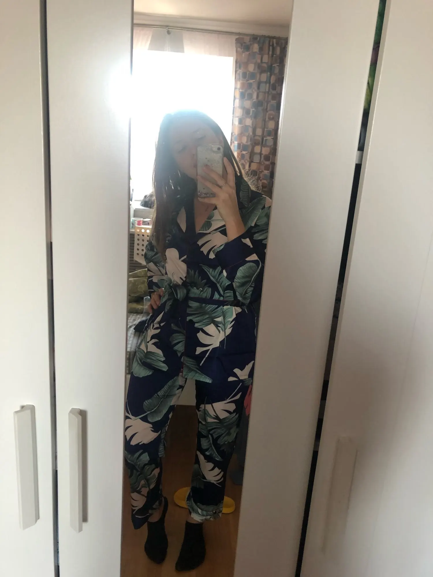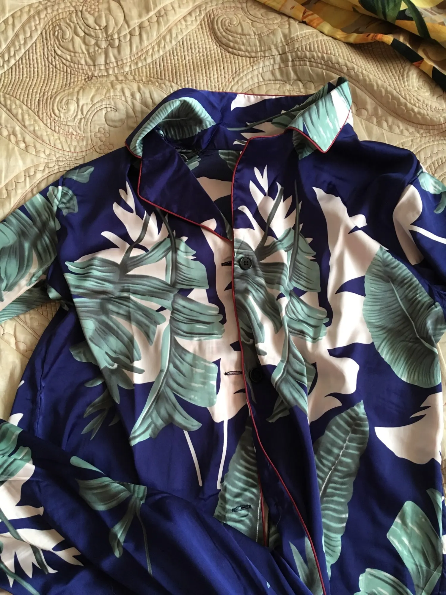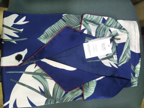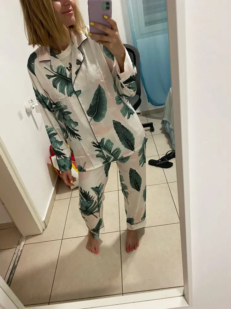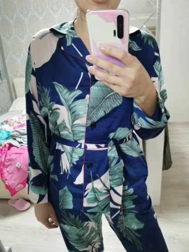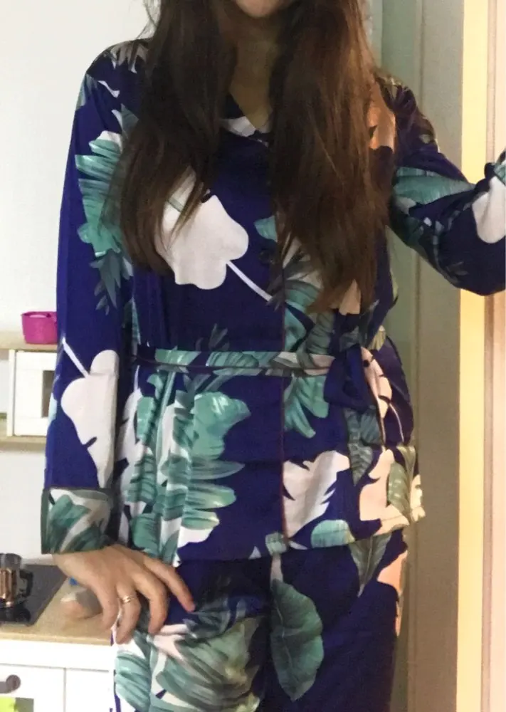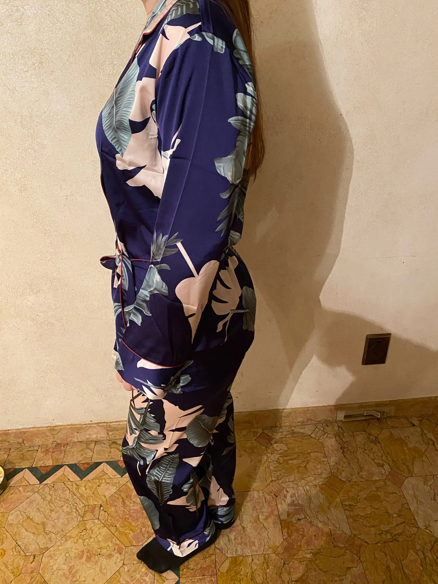 Пижама приехала во Владивосток за месяц. Идеально подошел размер "М" на парамерты 90×60×90 и рост 164 см. Меня полностью устроила длина верхней и нижней части пижамы. Цвет насыщеный с белыми, розовыми и зелеными цветами. В комплекте идет пояс. Купила по рекомендации и не пожелела!