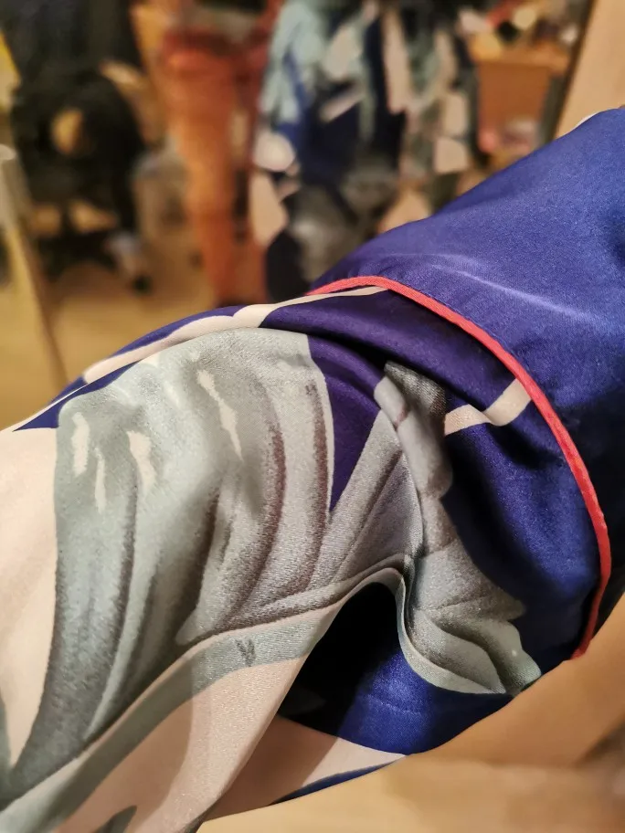 Пижама оказалась даже лучше, чем я предполагала. Ткань очень мягкая и приятная к телу, похожа на шёлк (но, конечно, искусственная). Смотрится тоже супер. На рост 182 штаны - чуть выше щиколотки, а вот рукав у верха по длине идеален. Небольшой минус - нет хлястиков для пояса, то есть его если снимаешь, то убирать надо. А в остальном все супер, очень довольна) Дошла за две недели примерно, хоть и доставка плюс (ждала пораньше)