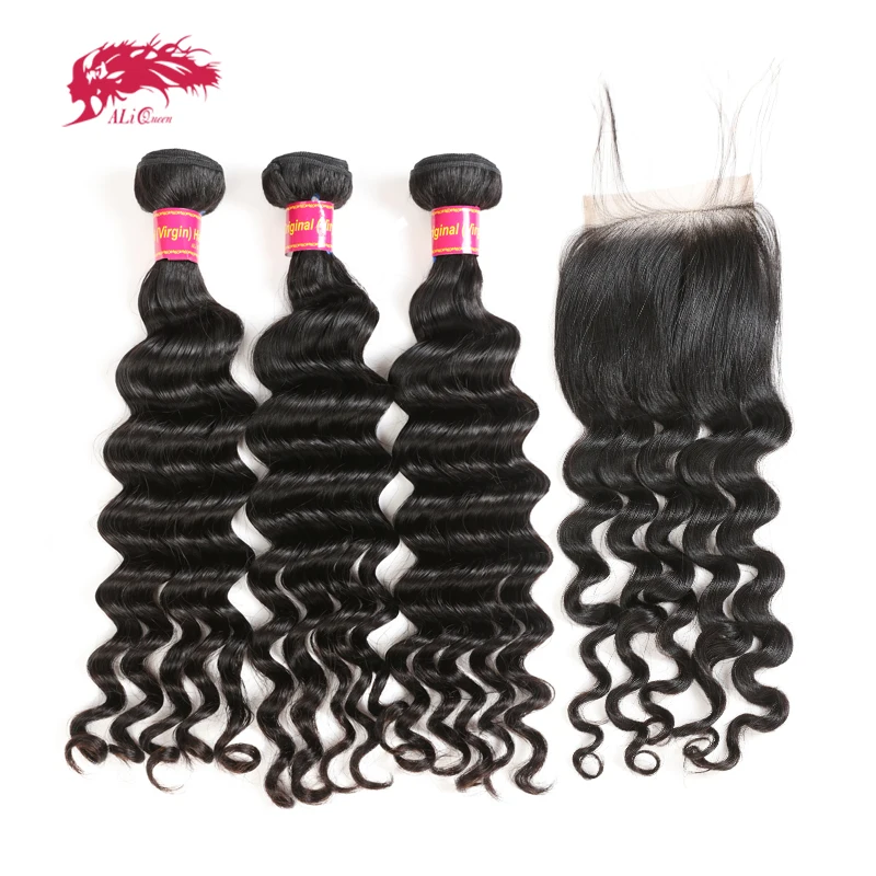 Ali Queen волос бразильский естественная волна 34 шт. натуральные человеческие волосы пряди с закрытием бесплатная часть пакеты естественного цвета пряди с фронтальной