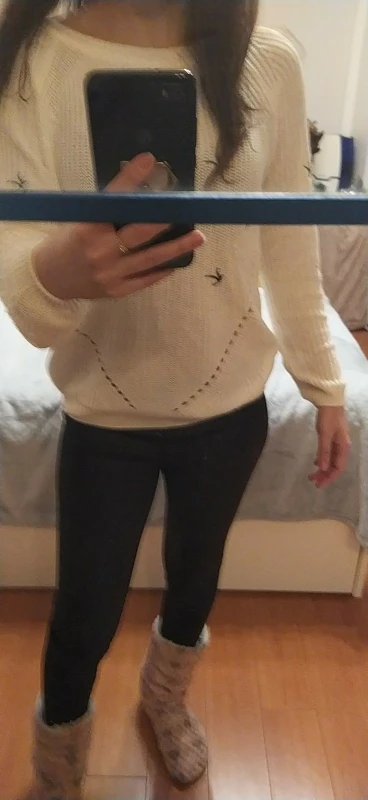 на рост 160 и размер s - сел отлично. Птички вышиты, на рукавах и низ кофты на резиночке, размер не указан. Поставила оценку на 4, так как раньше покупала этот же свитер из более плотной ткани. Покупала со скидкой на 8 марта примерно за 700 рублей.