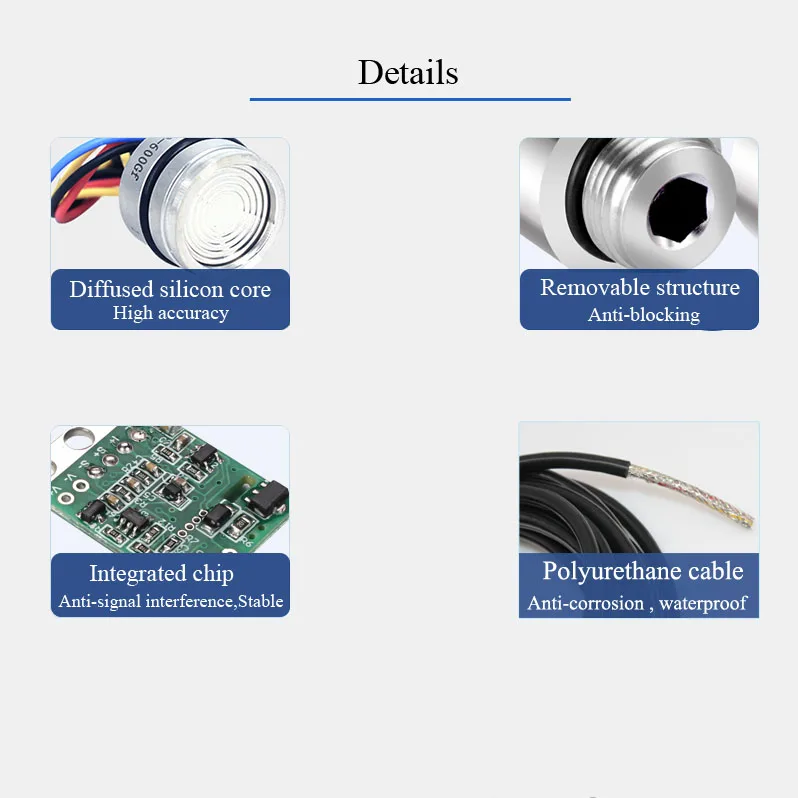 Передатчик уровня ввода/уровня воды использует диффузионный кремниевый чип для инкапсуляции диффузионного силиконового масляного сердечника в корпусе из нержавеющей стали. Передняя защитная крышка функционирует как защитная сенсорная диафрагма, а также позволяет жидкости плавно контактировать с диафрагмой. Провод и корпус герметичны и подключены. Вентиляционная труба подключается к внешней стороне кабеля. Внутренняя структура предназначена для предотвращения конденсации. Встроенная микросхема обработки сигнала используется для дистанционной передачи. Он имеет хорошую стабильность и надежность.
