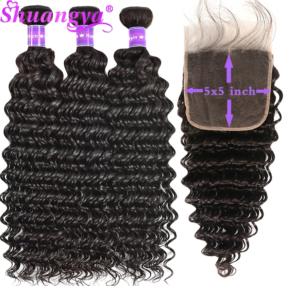 Shuangya волосы малазийские глубокая волна пряди с закрытием 100% человеческие волосы пряди с 4x4 закрытие 5X5 HD Кружева Закрытие с пряди
