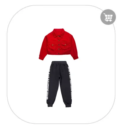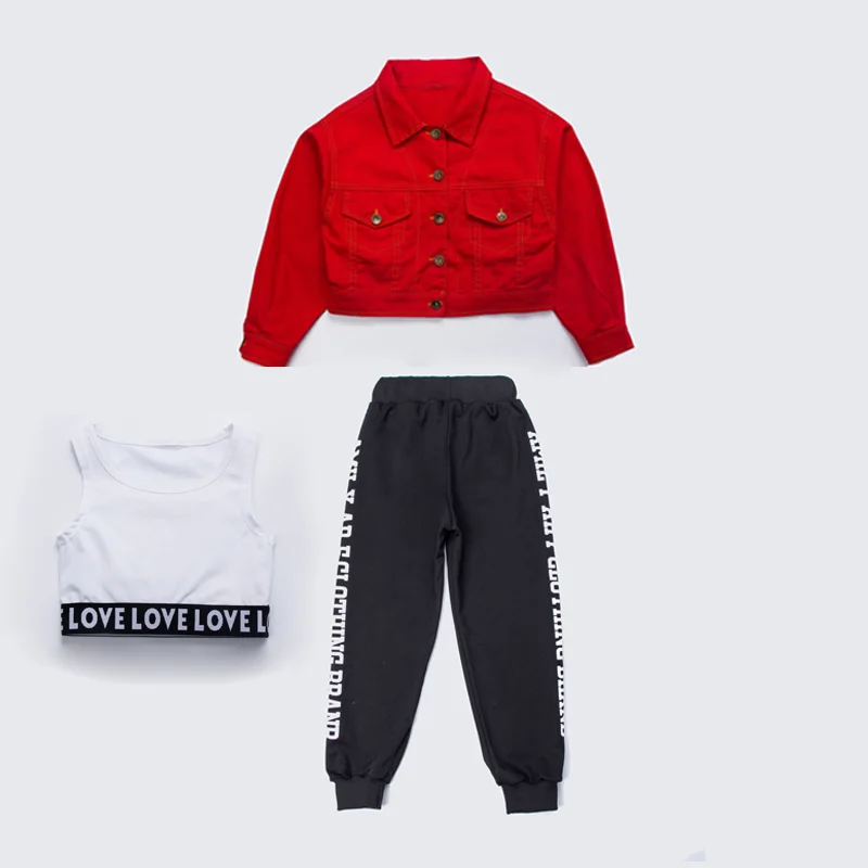 Детская одежда в стиле хип-хоп красное джинсовое пальто, джинсовая куртка короткий укороченный топ на бретелях, уличная одежда, штаны для девочек, костюм для джазовых танцев