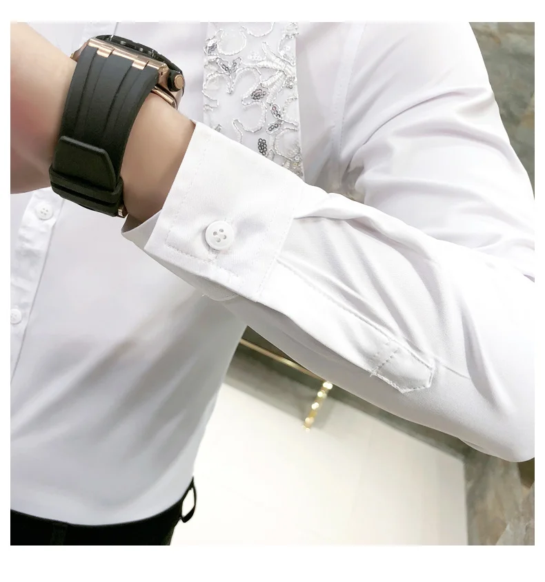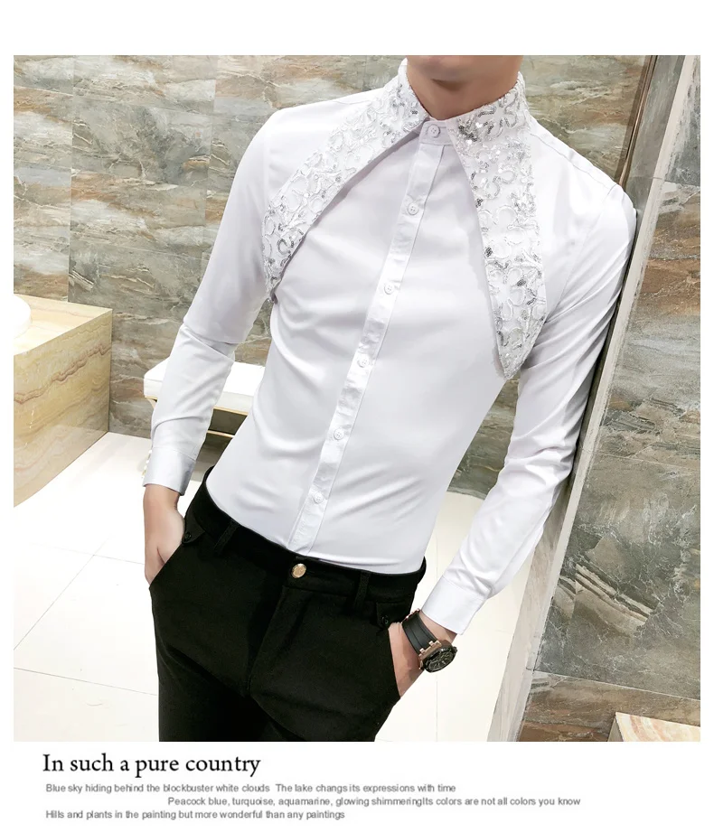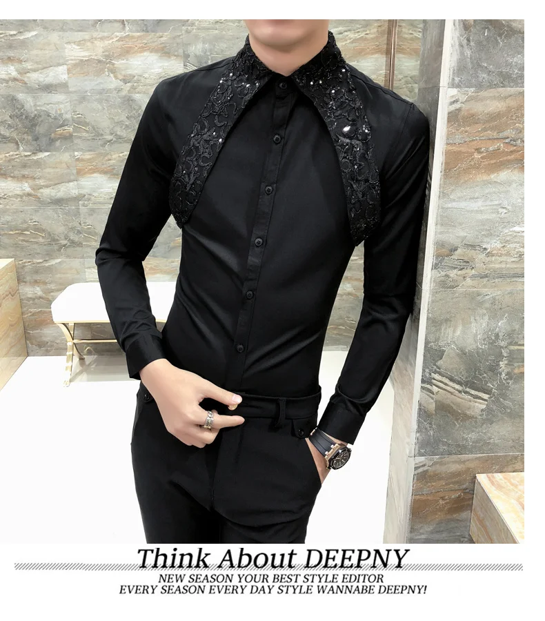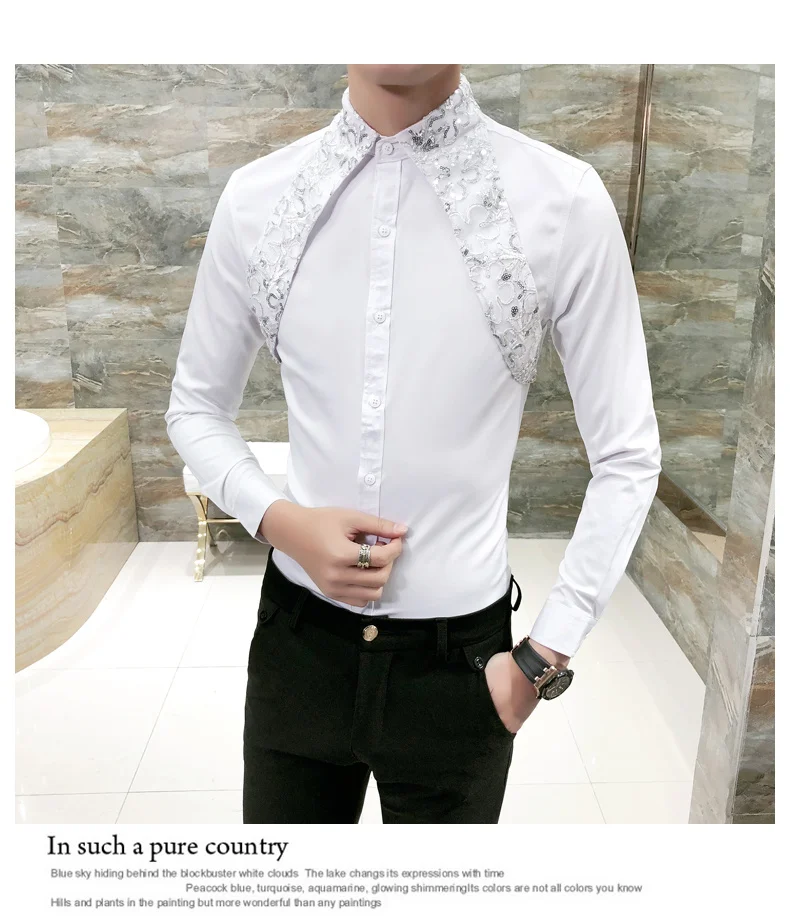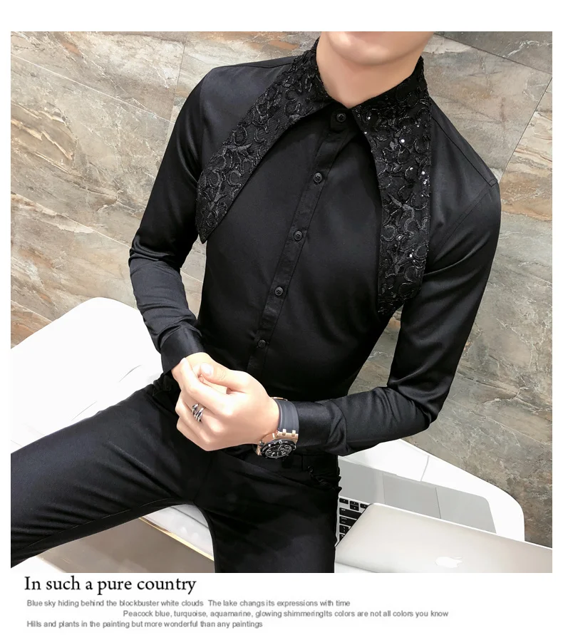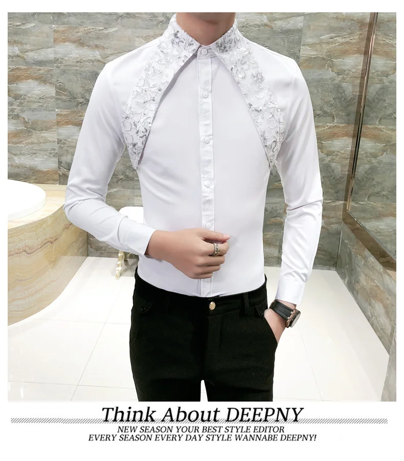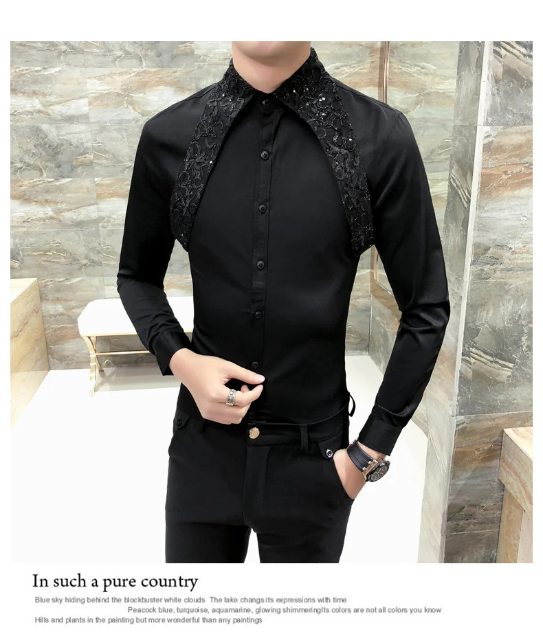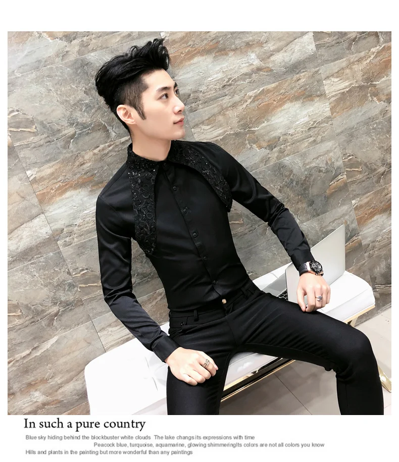Мужская кружевная рубашка, новинка 2018, дизайнерские свадебные рубашки для мужчин, модные черные и белые рубашки с длинным рукавом