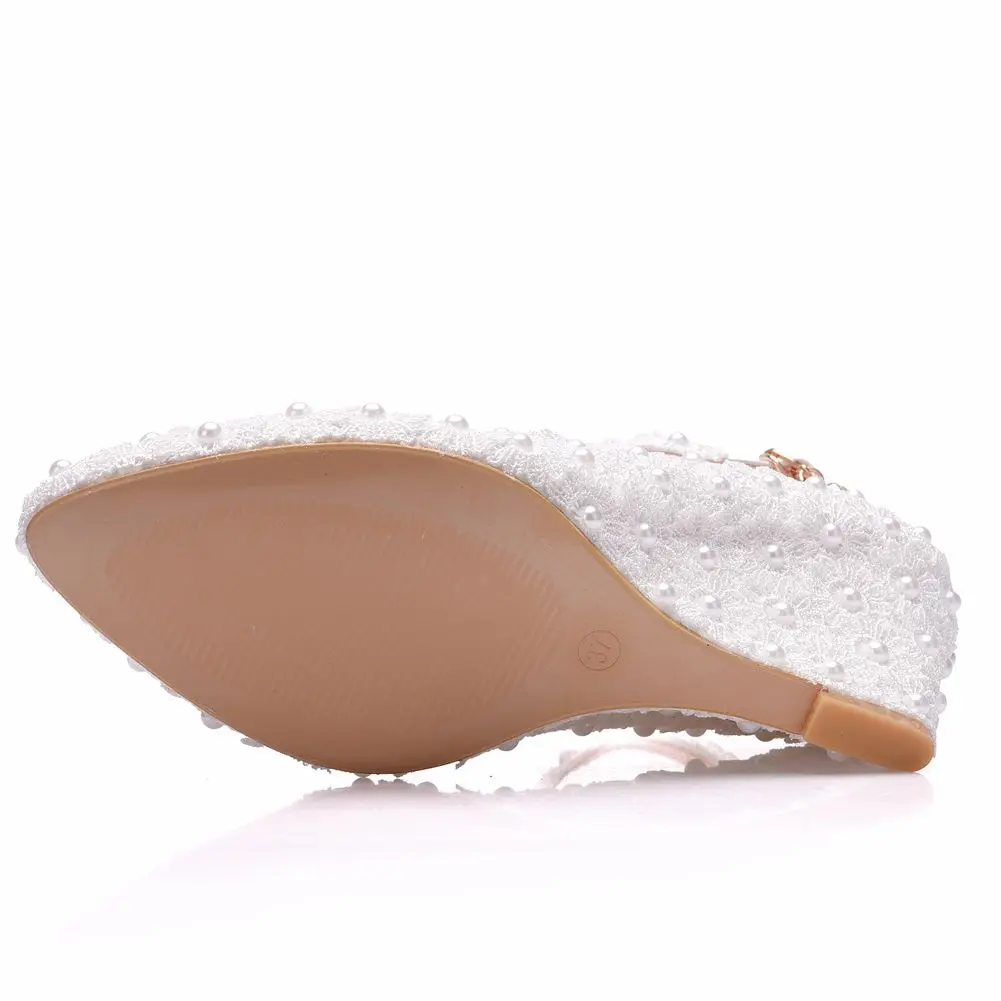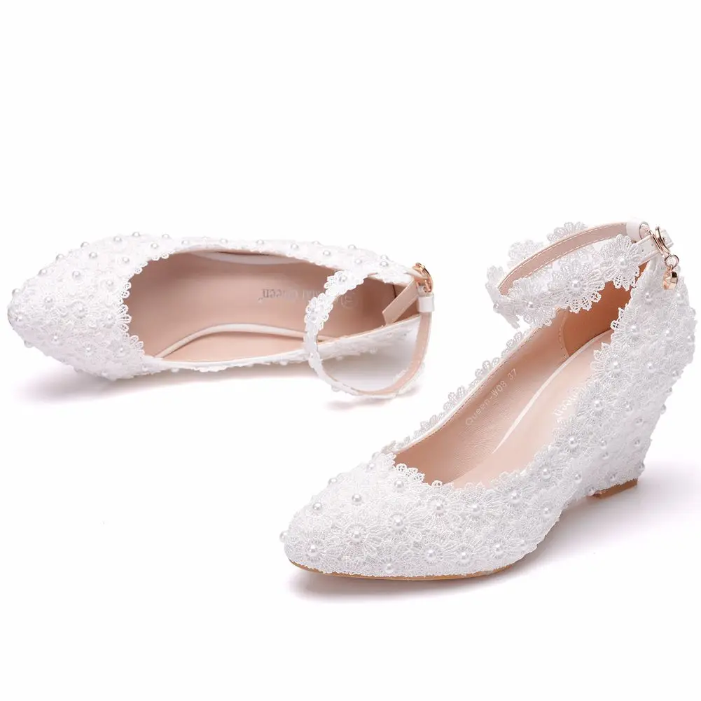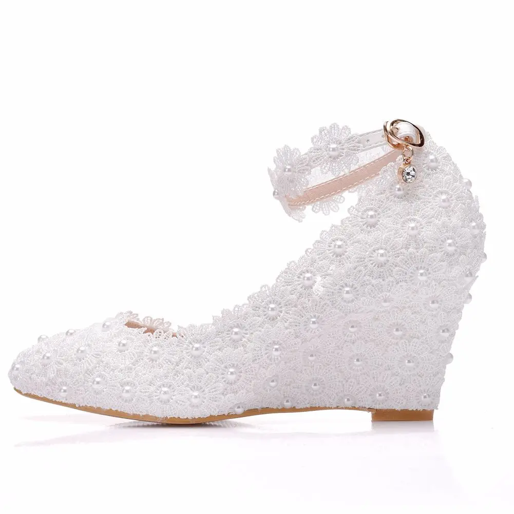 Туфли-лодочки женские свадебные на танкетке 8 см, со стразами, королевским белым цветком, кружевом, жемчугом, платьем для невесты