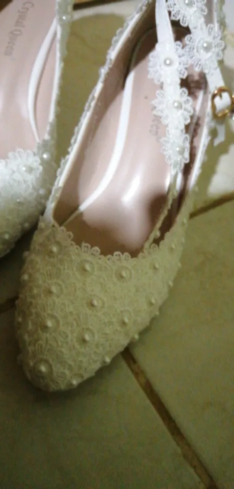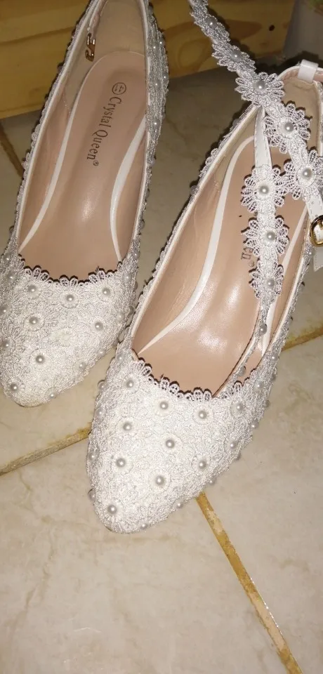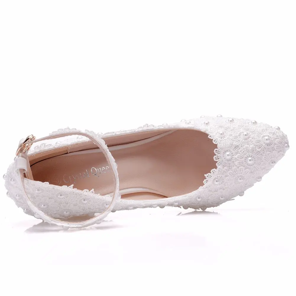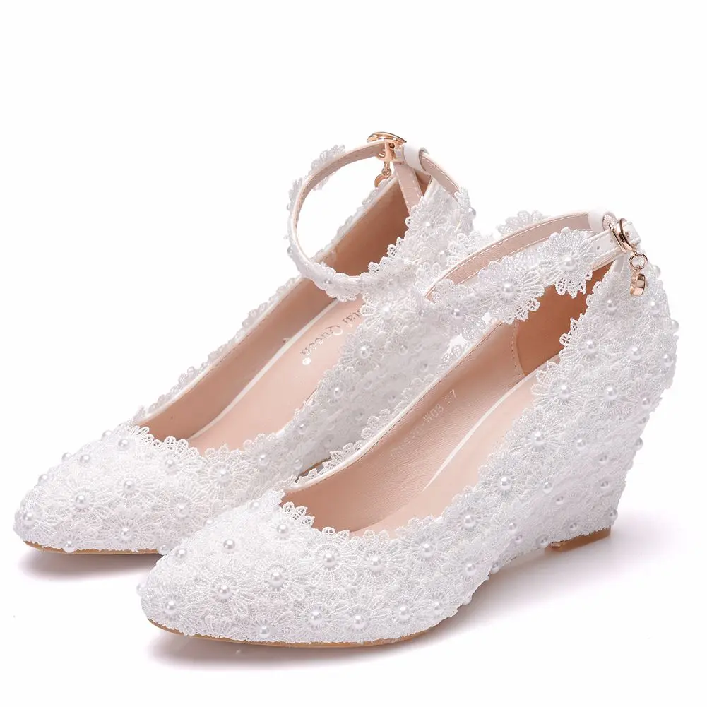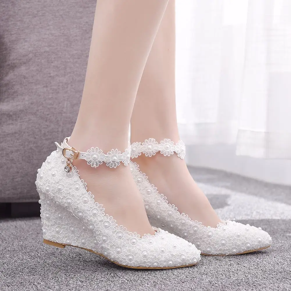 Туфли-лодочки женские свадебные на танкетке 8 см, со стразами, королевским белым цветком, кружевом, жемчугом, платьем для невесты