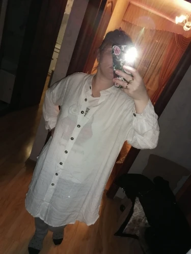 Доставка очень быстрая, трек отслуживался. Сама туника точно как в описании. Ткань мягкая, приятная к телу, практически непрозрачная. Пошито аккуратно, хотя торчало пару ниточек. На российский 46 в самый раз. На рост 163 см прикрывает колено. В целом, довольна.