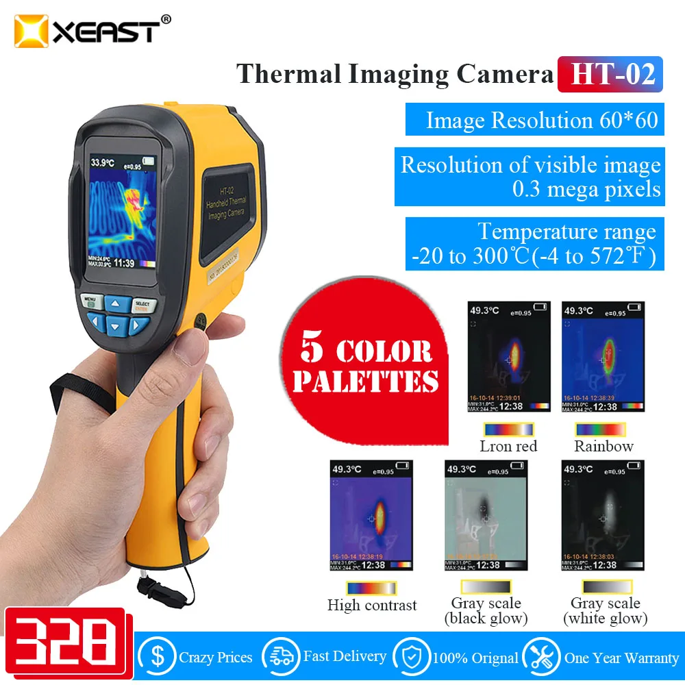 Полноцветный экран 3,2 дюйма обеспечивает детальное отображение созданных инфракрасных изображений; Разрешение 220x160 и разрешение визуального изображения 0,3 мегапикселей, изображение высокой четкости; Диапазон измерения температуры от -20 до 300 градусов по Цельсию / от -4 до 572 градуса по Фаренгейту, точность 2,5 градуса при условии хорошей работы; 5 видов палитры на выбор: радуга, железный красный, холодный цвет, черно-белый и бело-черный; Автоматическая настройка: 5 минут / 20 минут / не отключается автоматически; Встроенная SD-карта 4GB для хранения данных, фотографии также можно передать для проверки на телевизор, компьютер или другие устройства; Широко применяется в медицине, пожарной охране, археологии, дорожном движении, производстве электроники и других областях; Отдельные кнопки для конкретных функций, поэтому очень легко включить или выключить, удалить или проверить фотографии; Миниатюрная и портативная, размер 90 х 105 х 223 мм и вес 289 г, прилагается чехол, в котором удобно носить; Эргономичная ручка, которую удобно использовать и держать.