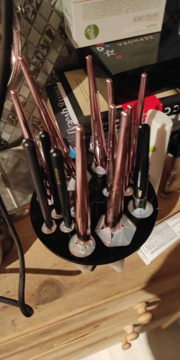 Соответствует описанию кроме цвета , на фото чёрный а пришло просто прессованное дерево , удобный в сборке в принципе подошло к моим кисточкам