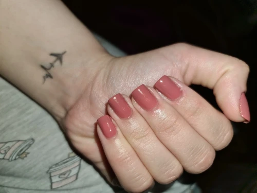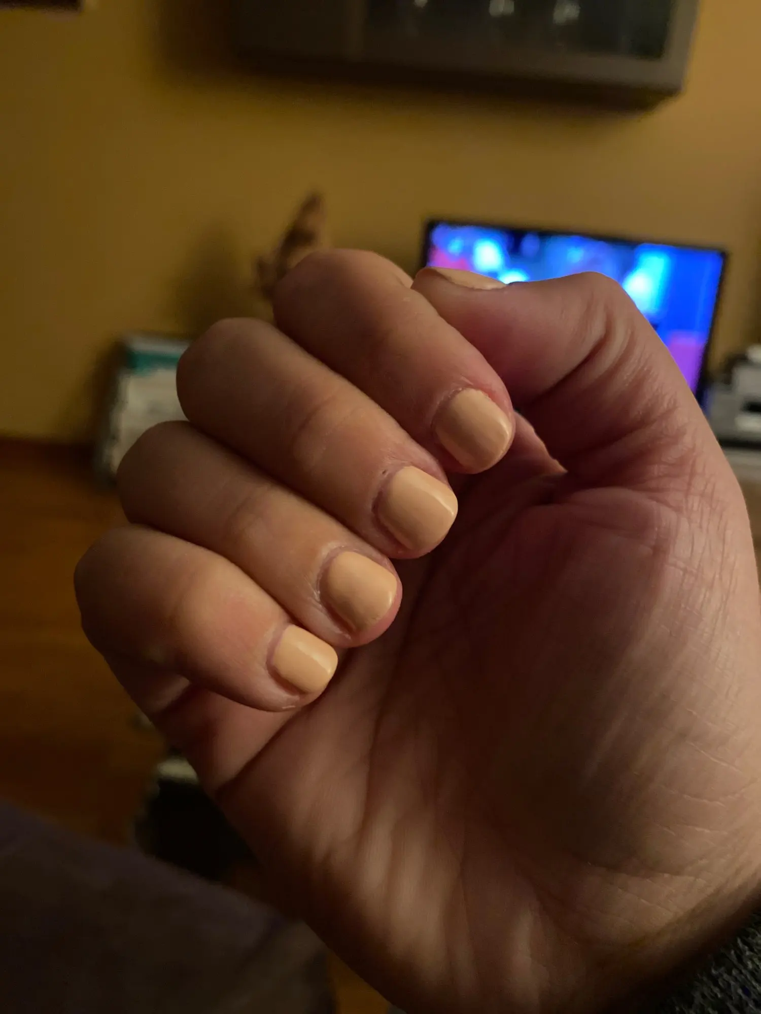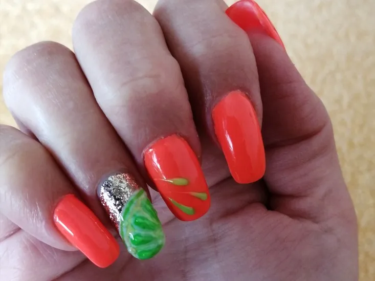 Совпадает по описанию, мне лично понравилось наносить этот цвет в один тонкий слой, тогда он такой приглушённый морковный получается, (на верхней типсе)