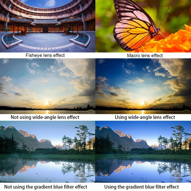 D: клетка для мобильного телефона + широкоугольный объектив + макрообъектив + ремень + телеобъектив + объектив рыбий глаз + голубые линзы Grad + объектив Star 8